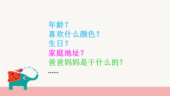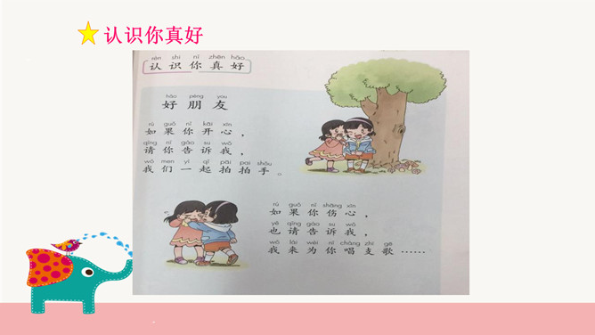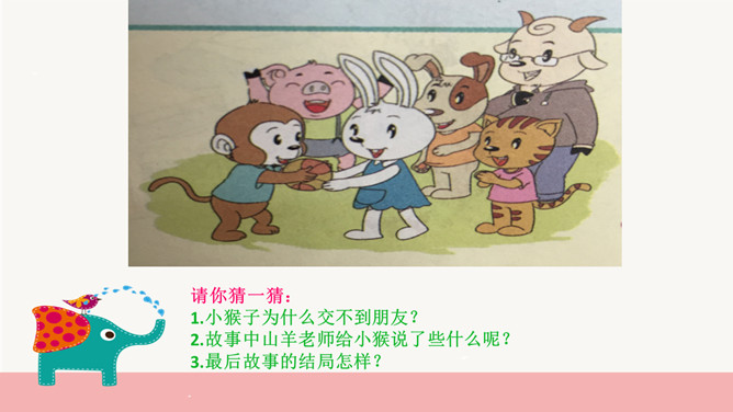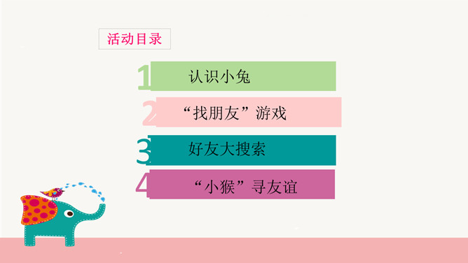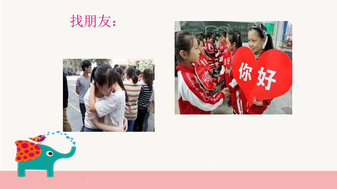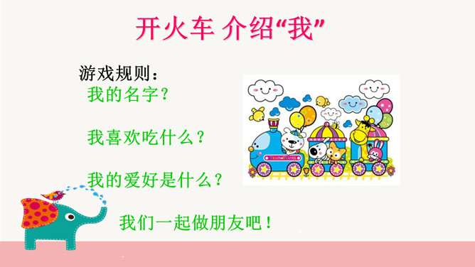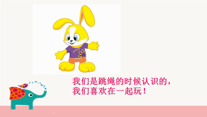 认识小兔。“找朋友”游戏。好友大搜索。“小猴”寻友谊。大家好,我叫贝贝!我的好伙伴是小喵!我们是跳绳的时候认识的,我们喜欢在一起玩!开火车 介绍“我”。游戏规则:我的名字?我喜欢吃什么?我的爱好是什么?我们一起做朋友吧!年龄?喜欢什么颜色?生日?家庭地址?爸爸妈妈是干什么的?游戏规则:全班同学分两组站成里外两个圆圈,边走边唱《找朋友》,每次在歌曲结束后两个圆的同学面对面站立, 面对的两个人主动打招呼问好,介绍自己,并说上:“我想和你交朋友。”所属专题:拉拉手交朋友ppt。