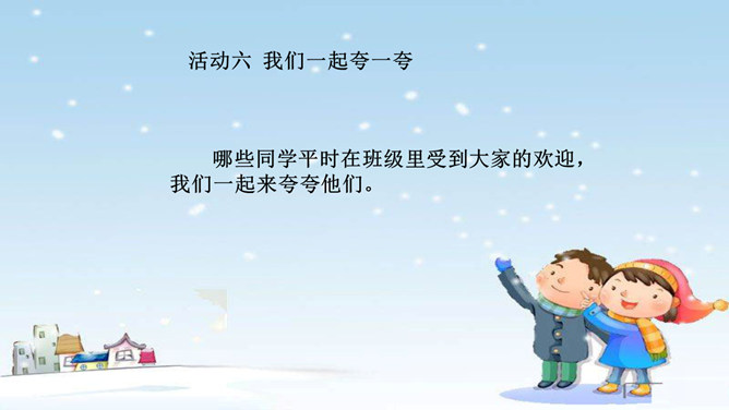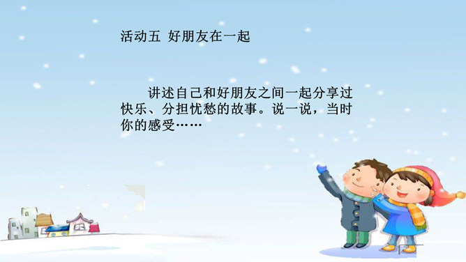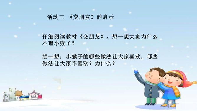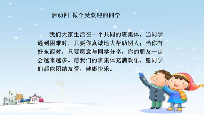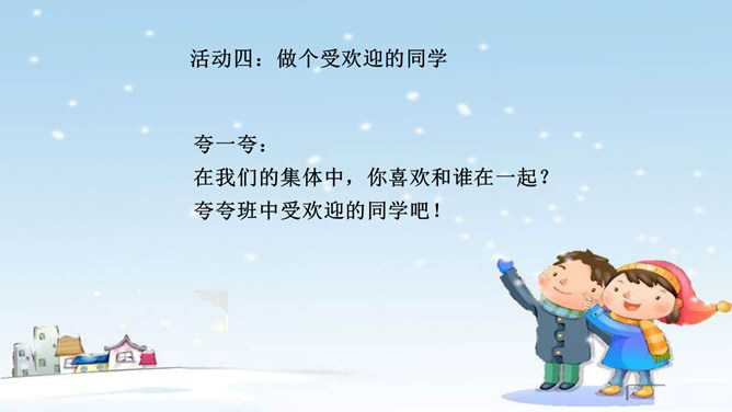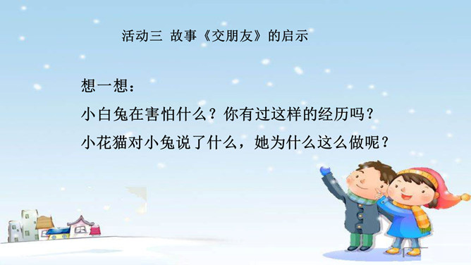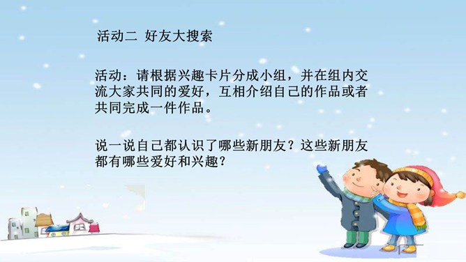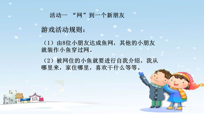 活动一 “网”到一个新朋友。游戏活动规则:(1)由8位小朋友达成鱼网,其他的小朋友就装作小鱼穿过网。(2)被网住的小鱼就要进行自我介绍,我从哪里来,家住哪里,喜欢干什么等等。活动二 好友大搜索。活动:请根据兴趣卡片分成小组,并在组内交流大家共同的爱好,互相介绍自己的作品或者共同完成一件作品。说一说自己都认识了哪些新朋友?这些新朋友都有哪些爱好和兴趣?想一想:小白兔在害怕什么?你有过这样的经历吗?小花猫对小兔说了什么,她为什么这么做呢?所属专题:拉拉手交朋友ppt。