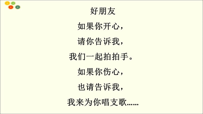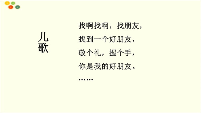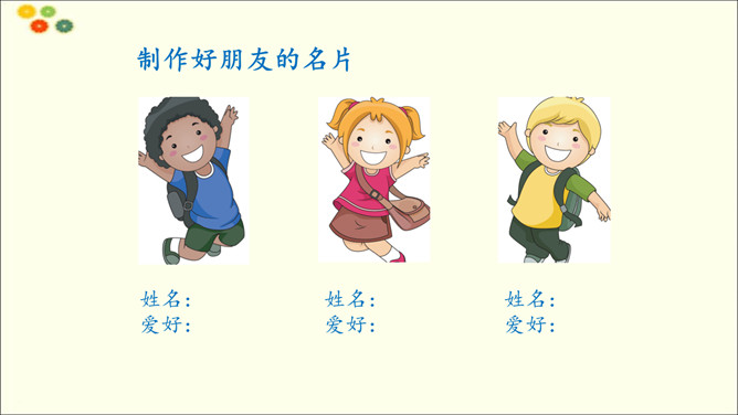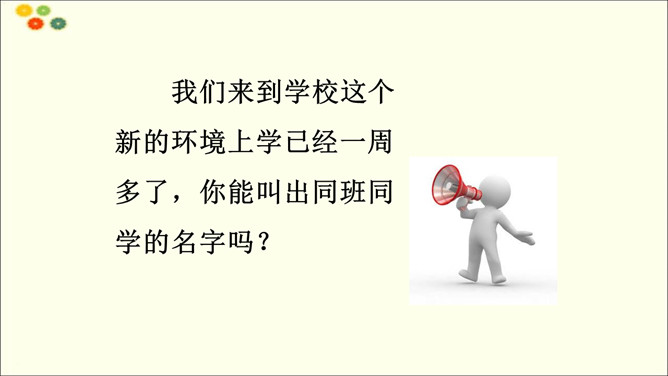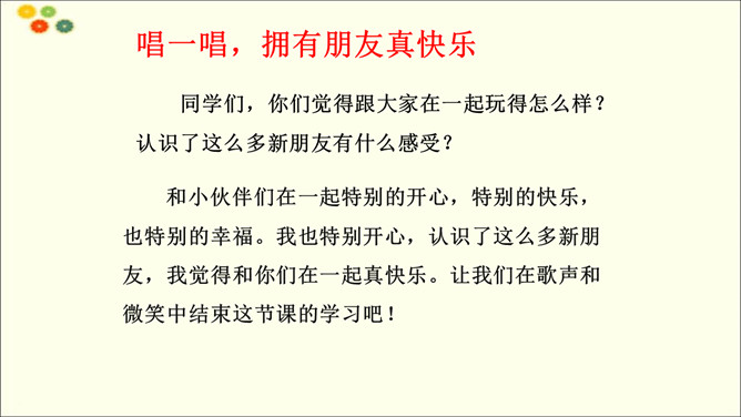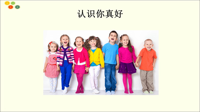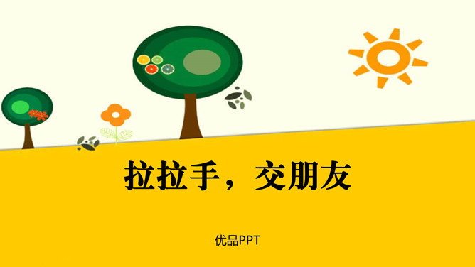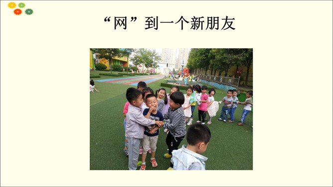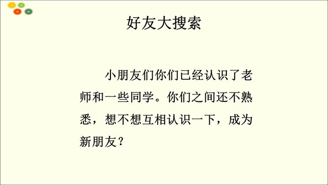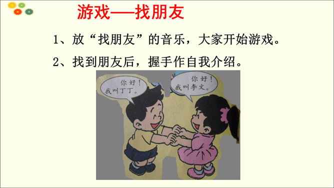 1、放“找朋友”的音乐,大家开始游戏。2、找到朋友后,握手作自我介绍。我们来到学校这个新的环境上学已经一周多了,你能叫出同班同学的名字吗?说说看,谁是你的好伙伴,你们是怎么认识的?小朋友们你们已经认识了老师和一些同学。你们之间还不熟悉,想不想互相认识一下,成为新朋友?同学之间进行自我介绍(自己的姓名、特征、喜好及家庭等简单情况)。同学们,你们觉得跟大家在一起玩得怎么样?认识了这么多新朋友有什么感受?和小伙伴们在一起特别的开心,特别的快乐,也特别的幸福。所属专题:拉拉手交朋友ppt。