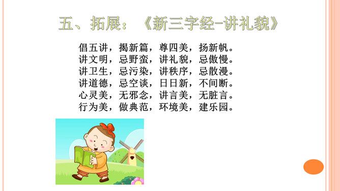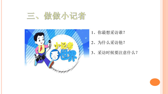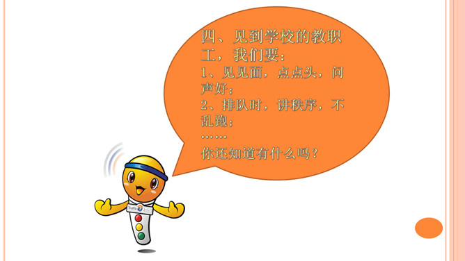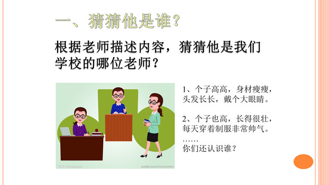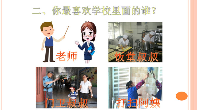 一、猜猜他是谁?根据老师描述内容,猜猜他是我们学校的哪位老师?1、个子高高,身材瘦瘦,头发长长,戴个大眼睛。2、个子也高,长得很壮,每天穿着制服非常帅气。……你们还认识谁?二、你最喜欢学校里面的谁?三、做做小记者。1、你最想采访谁?2、为什么采访他?3、采访时候要注意什么?四、见到学校的教职工,我们要:1、见见面,点点头,问声好;2、排队时,讲秩序,不乱跑;……你还知道有什么吗?