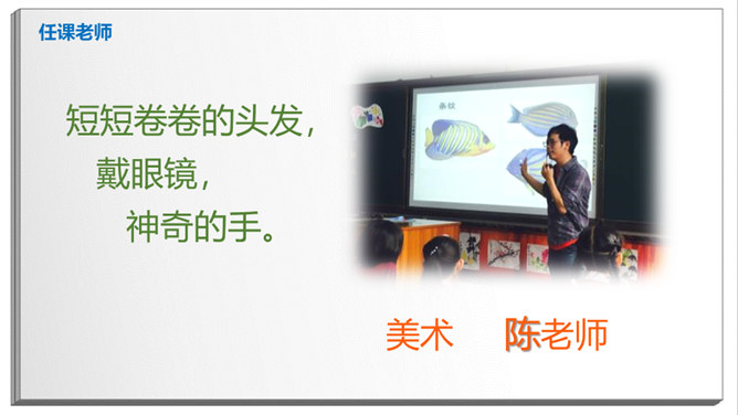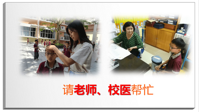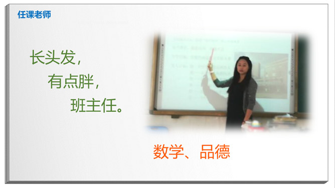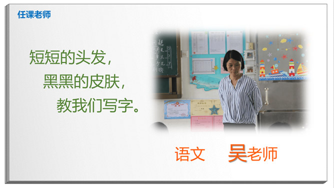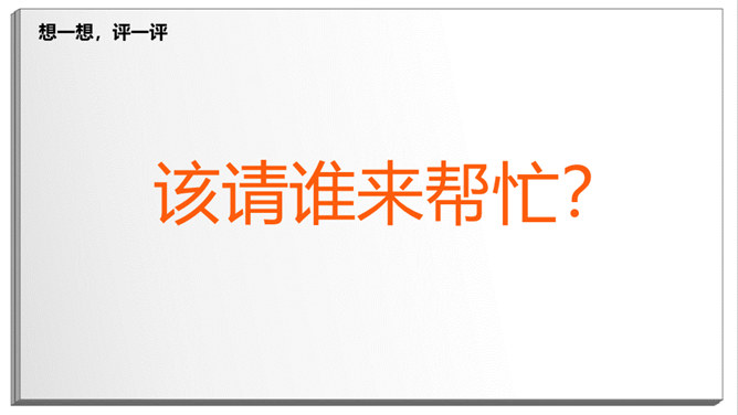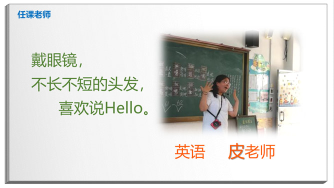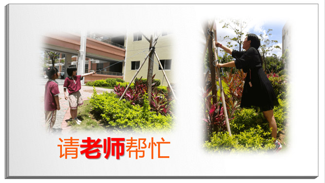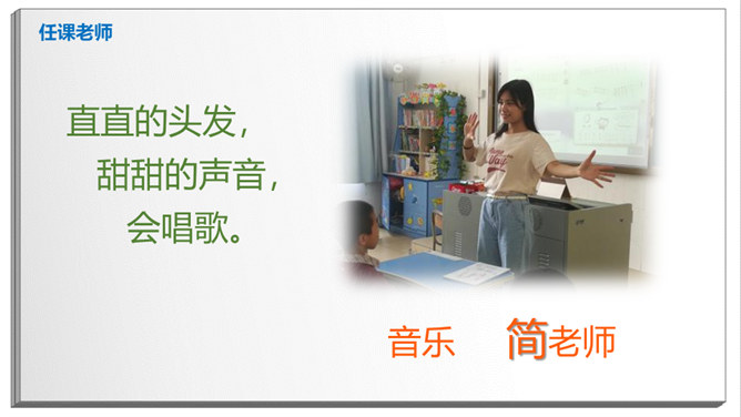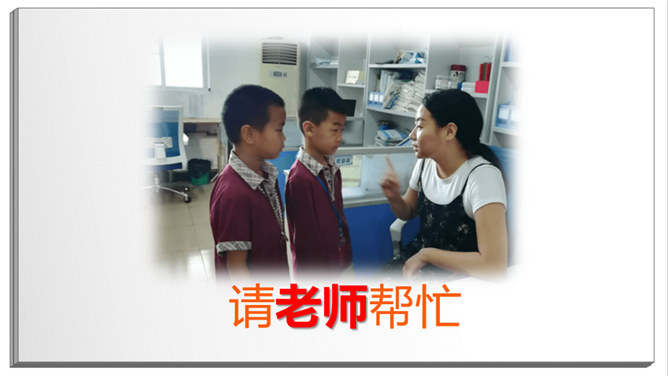长头发,有点胖,班主任。数学、品德。猜一猜:短短的头发,黑黑的皮肤,教我们写字。直直的头发,甜甜的声音,会唱歌。挺直的身板,沙沙的声音,动作很快。短短卷卷的头发,戴眼镜,神奇的手。戴眼镜,不长不短的头发,喜欢说Hello。该请谁来帮忙?跳绳不小心打到树上了,请老师帮忙。头晕、不舒服,请老师、校医帮忙。课后,和同学有矛盾,请老师帮忙。放学了,家长没来接,请保安叔叔帮忙。这样做对吗?在办公室门口玩游戏。跟值日老师说:“老师再见。”在老师说话时插嘴。