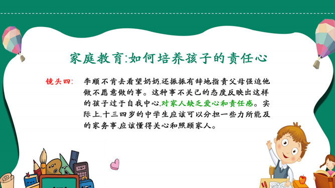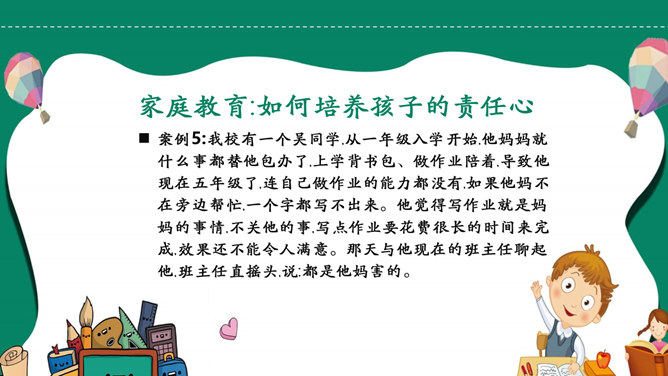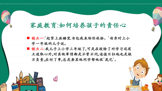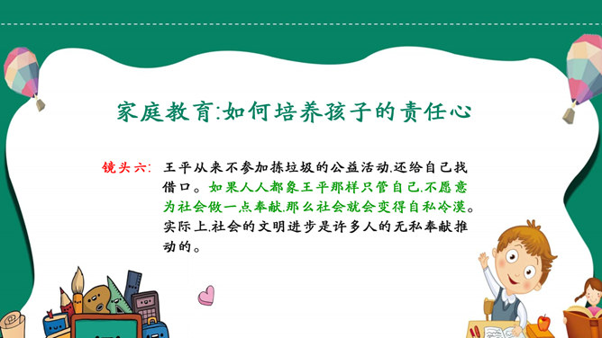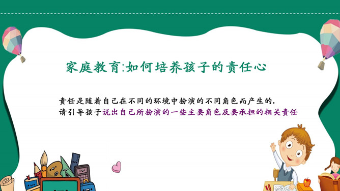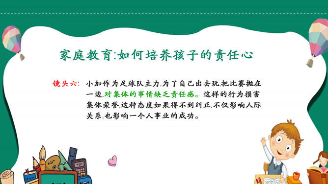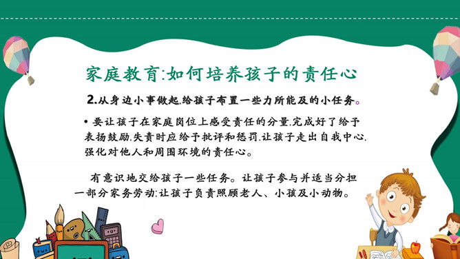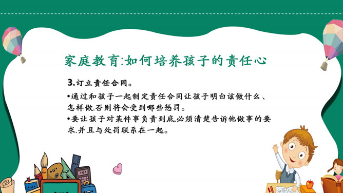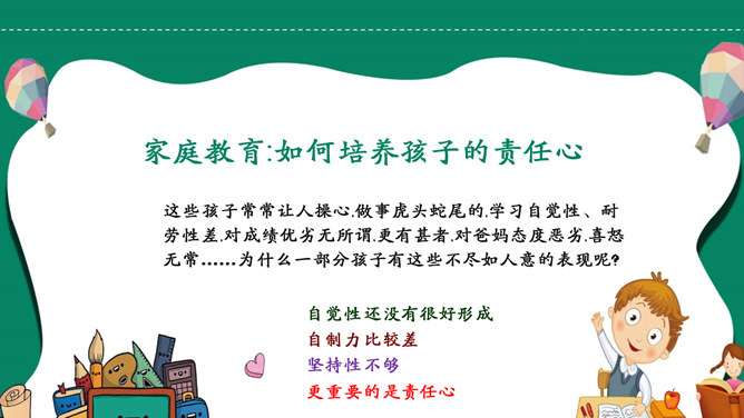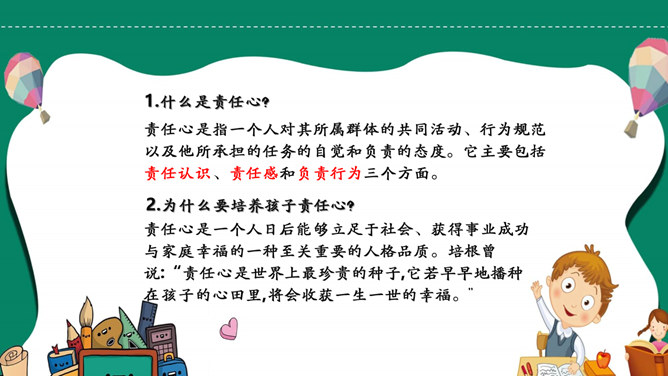 如何培养孩子的责任心PPT模板。责任心是指一个人对其所属群体的共同活动、行为规范以及他所承担的任务的自觉和负责的态度。它主要包括责任认识、责任感和负责行为三个方面。