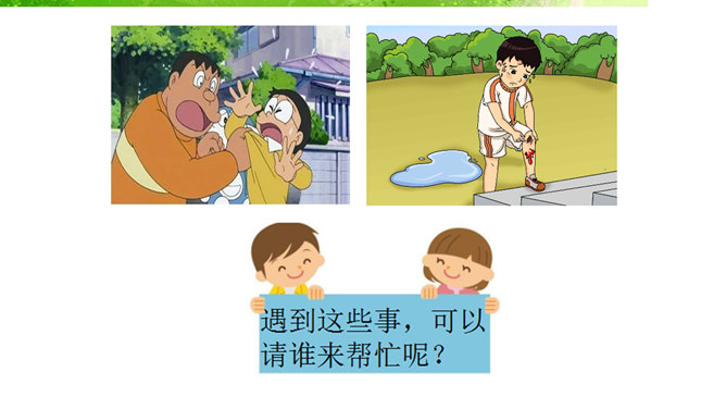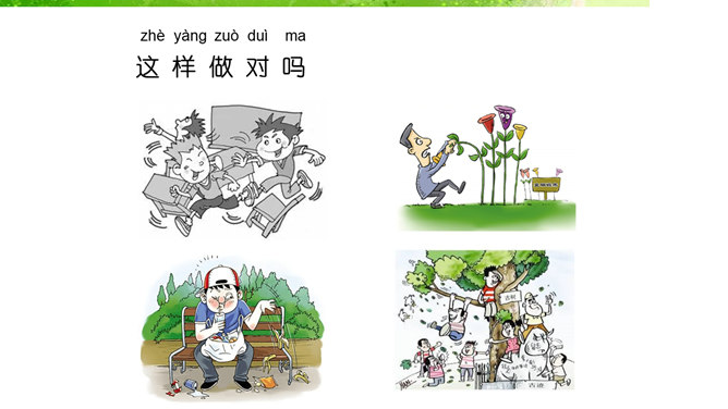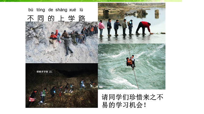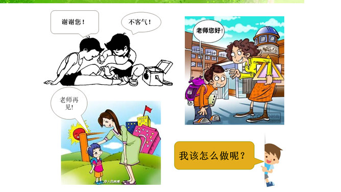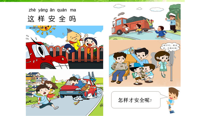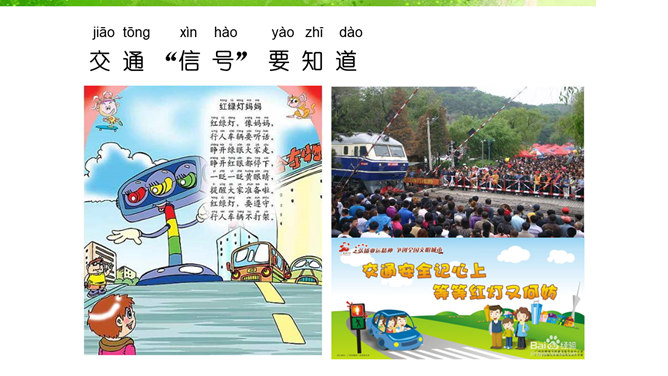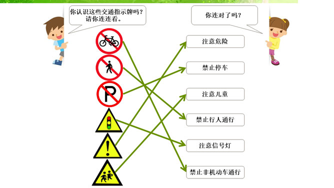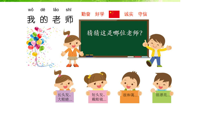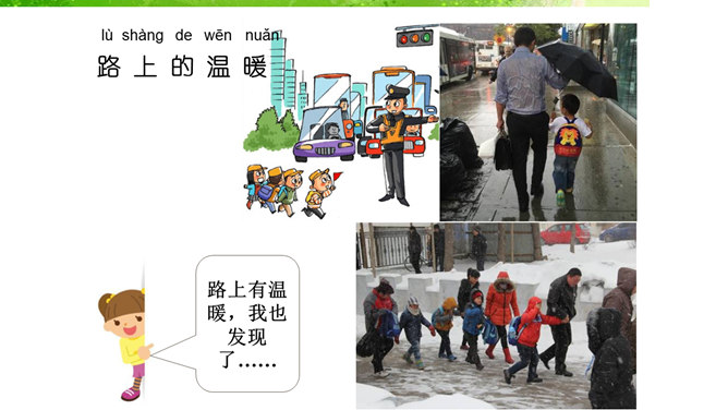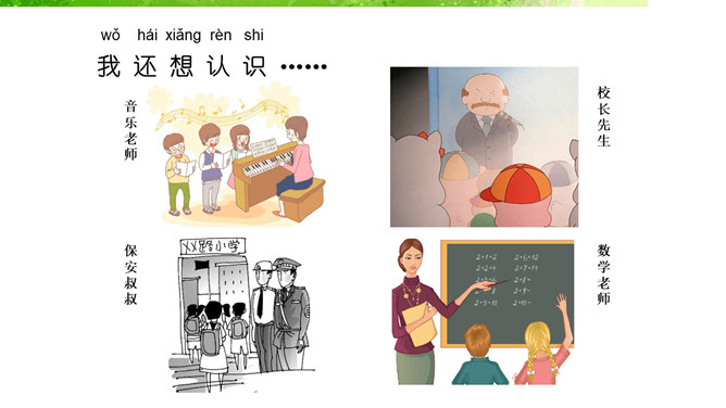 我的老师,猜猜这是哪位老师?长头发、大眼睛...短头发、戴眼镜...我还想认识 ……音乐老师、校长先生、数学老师、保安叔叔。该请谁来帮帮我。这样做对吗?我该怎么做呢?请同学们珍惜来之不易的学习机会!我......来学校,路上经过……。上学路不一样,平平安安进课堂。路上有温暖,我也发现了……你认识这些交通指示牌吗?请你连连看。小学生,上学校,交通“信号”要知道。红灯停,绿灯行,过路口时左右瞧。靠右行,不追跑,抓紧时间不迟到。