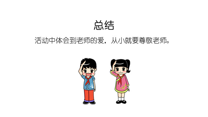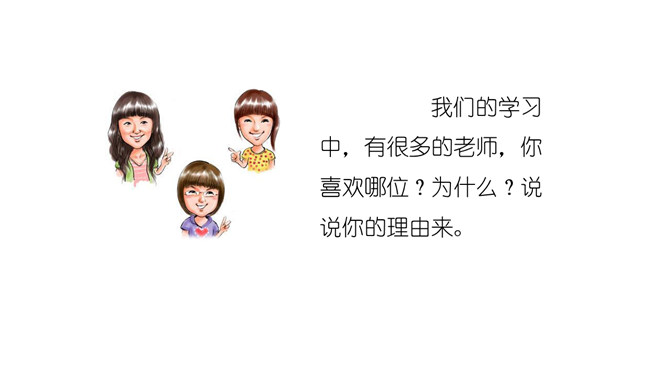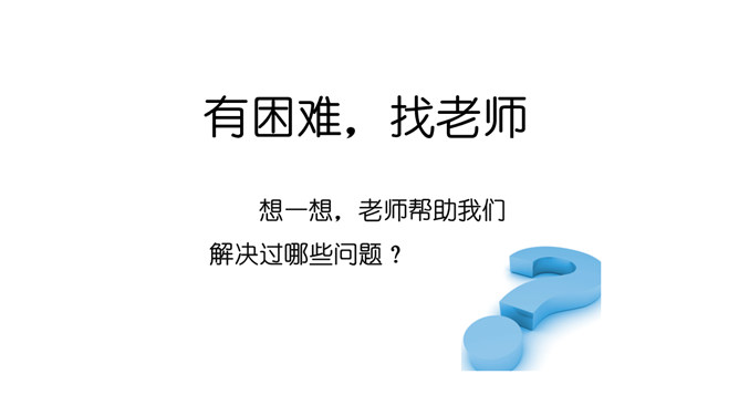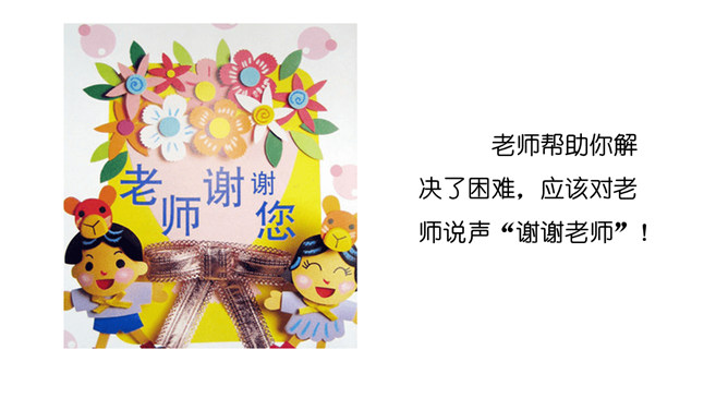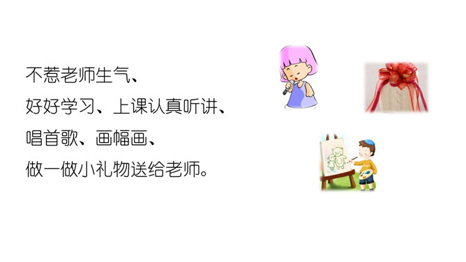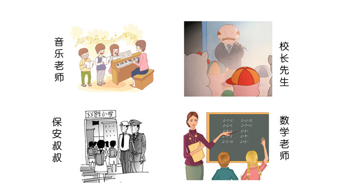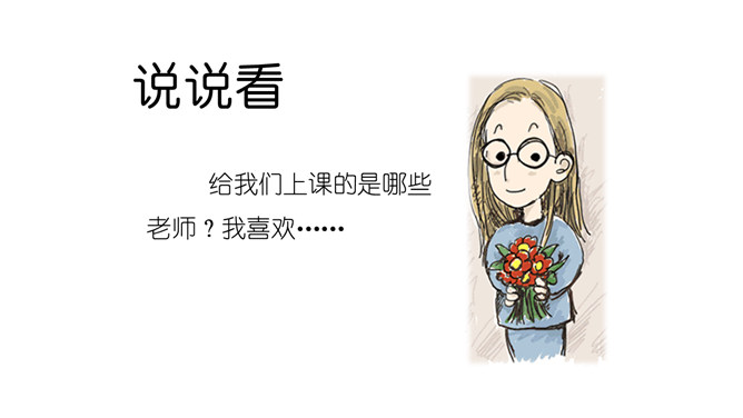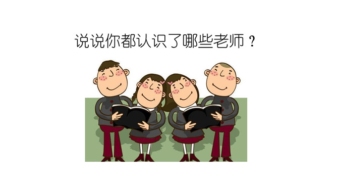 说说你都认识了哪些老师?给我们上课的是哪些老师?我喜欢……我们的学习中,有很多的老师,你喜欢哪位?为什么?说说你的理由来。我还想认识……在学校有难题,生病了,怎么办?想一想,老师帮助我们解决过哪些问题?老师帮助你解决了困难,应该对老师说声“谢谢老师”!一起来看看课本第13页上的四幅图,看看他们做得对吗?我该怎么做呢?不惹老师生气、好好学习、上课认真听讲、唱首歌、画幅画、做一做小礼物送给老师。活动中体会到老师的爱,从小就要尊敬老师。