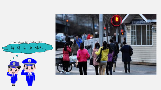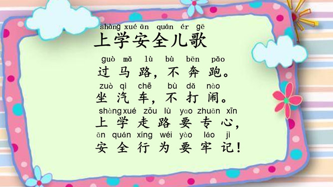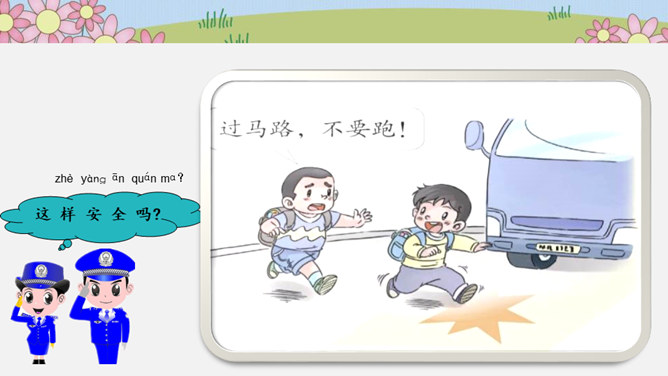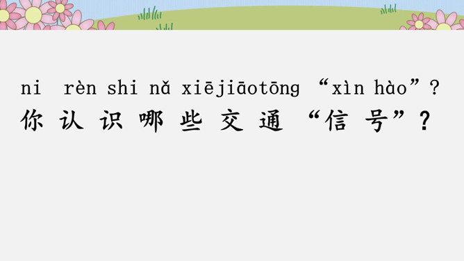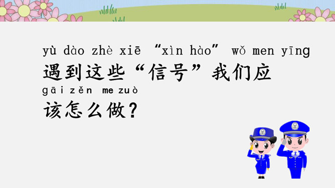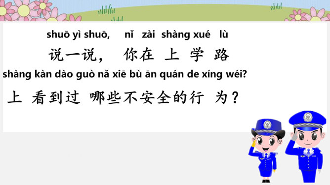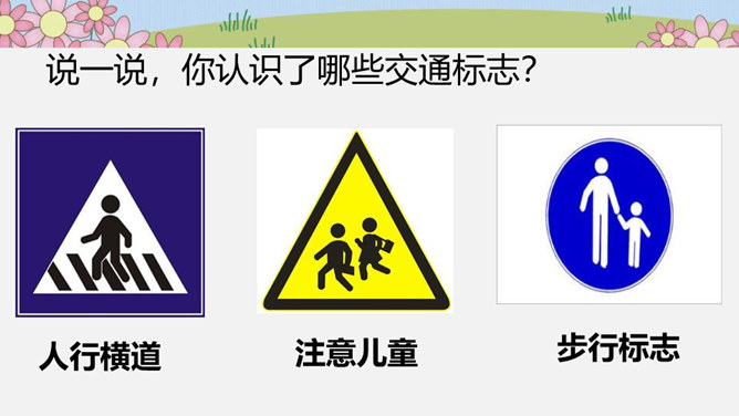 说一说,你在上学路上看到过哪些不安全的行为?上学安全儿歌:过马路,不奔跑。坐汽车,不打闹。上学走路要专心,安全行为要牢记!你认识哪些交通“信号”?说一说,你认识了哪些交通标志?交通信号有哪些?遇到这些“信号”我们应该怎么做?所属专题:上学路上ppt。