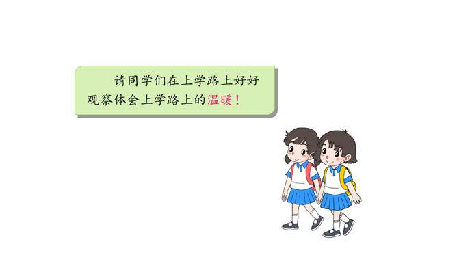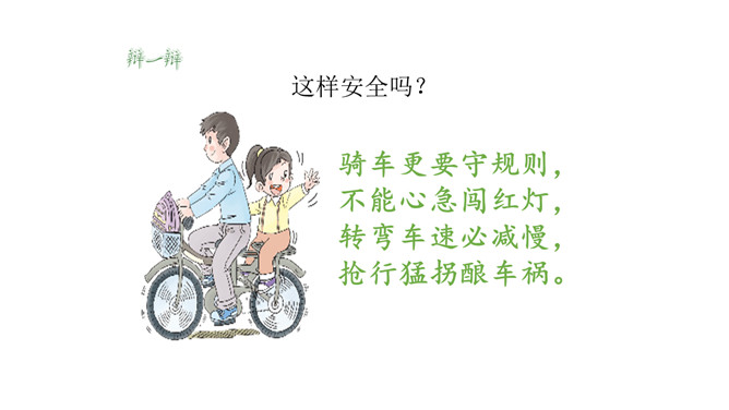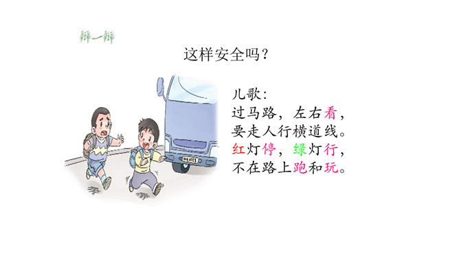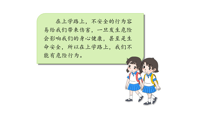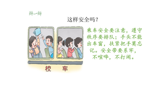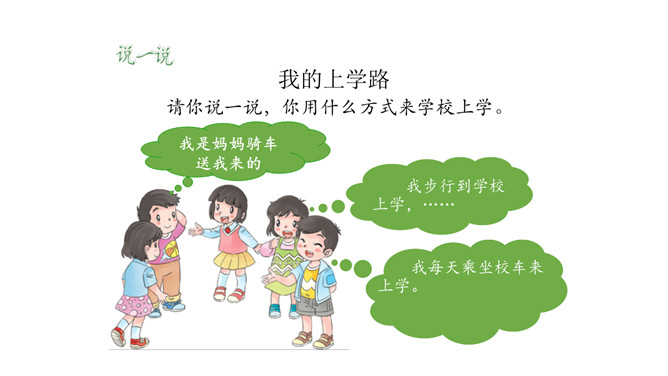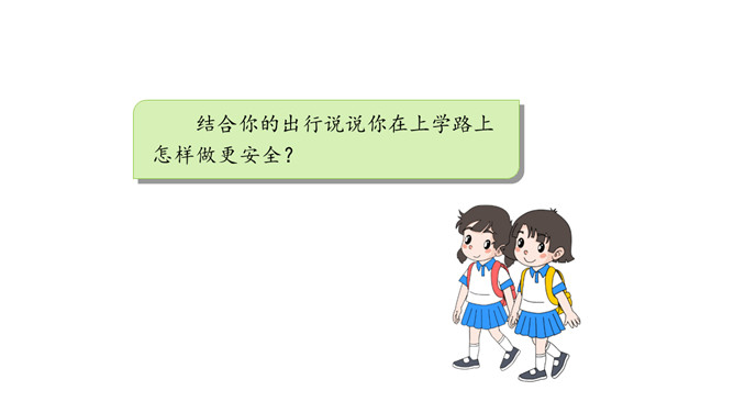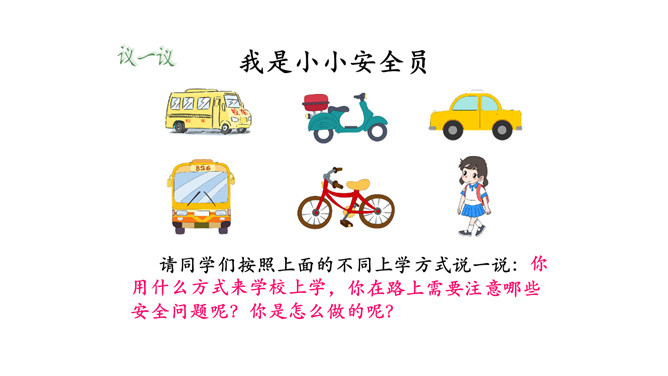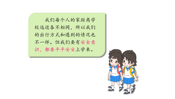 我们每个人的家距离学校远近各不相同,所以我们的出行方式和遇到的情况也不一样。但我们要有安全意识,都要平平安安上学来。请同学们按照上面的不同上学方式说一说:你用什么方式来学校上学,你在路上需要注意哪些安全问题呢?你是怎么做的呢?这些同学们的做法安全吗?说一说,如果你跟图上的小朋友一起上下学,此时,你会说些什么?做些什么?这样安全吗?乘车安全要注意,遵守秩序要排队;手头不能出车窗,扶紧把手莫忘记。安全带要系牢,不喧哗,不打闹。所属专题:上学路上ppt。