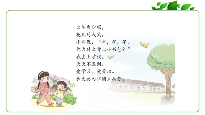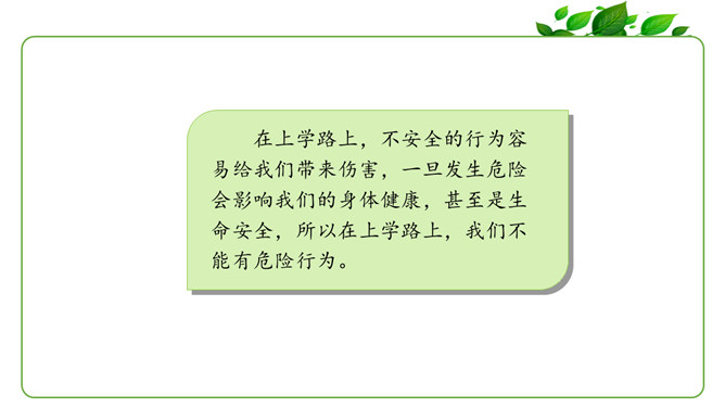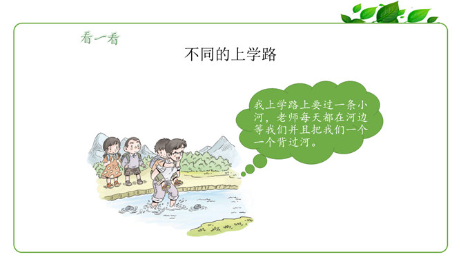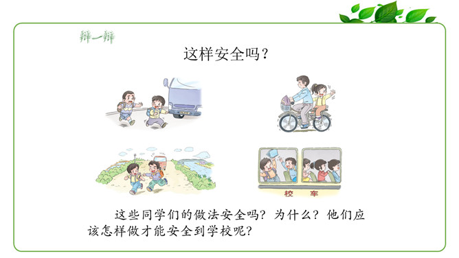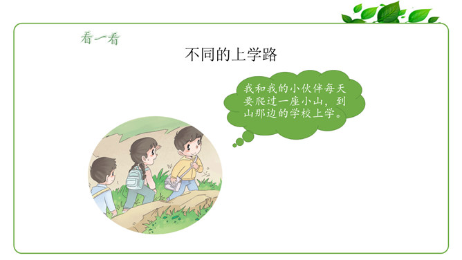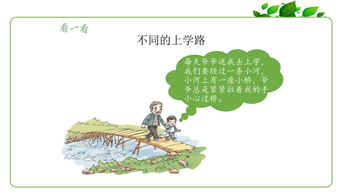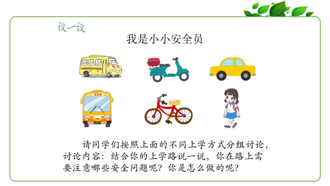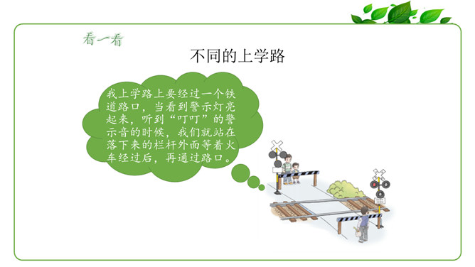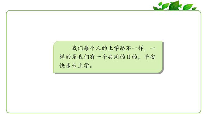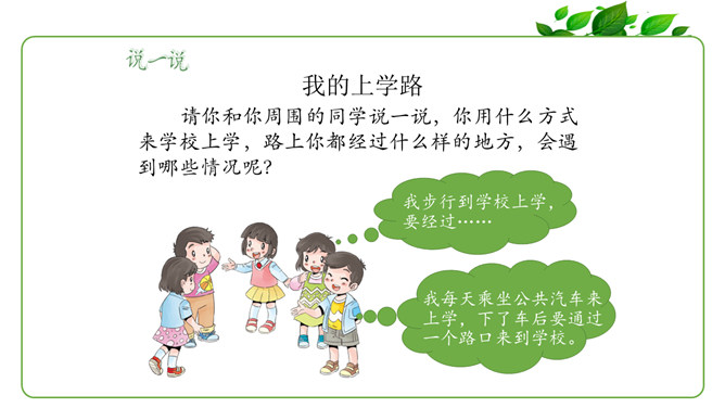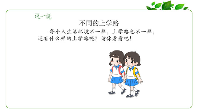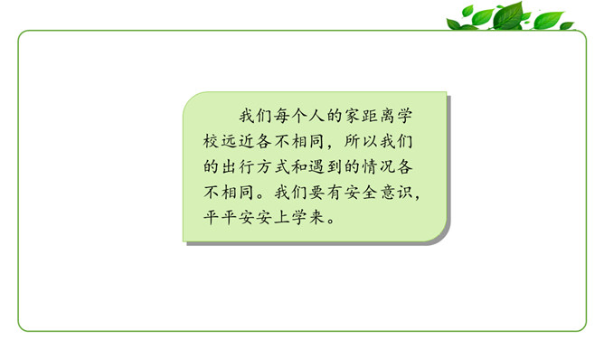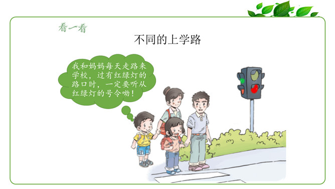 请你和你周围的同学说一说,你用什么方式来学校上学,路上你都经过什么样的地方,会遇到哪些情况呢?我步行到学校上学,要经过……我每天乘坐公共汽车来上学,下了车后要通过一个路口来到学校。我们每个人的家距离学校远近各不相同,所以我们的出行方式和遇到的情况各不相同。我们要有安全意识,平平安安上学来。每个人生活环境不一样,上学路也不一样,还有什么样的上学路呢?请你看看吧!我和妈妈每天走路来学校,过有红绿灯的路口时,一定要听从红绿灯的号令呦!所属专题:上学路上ppt。