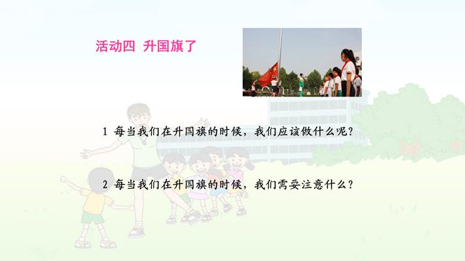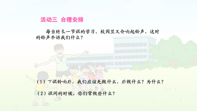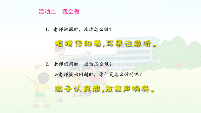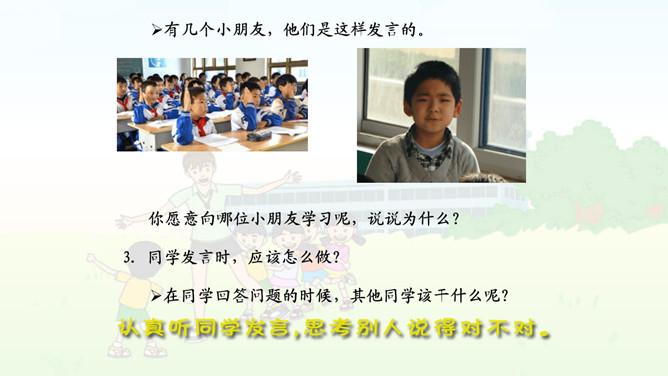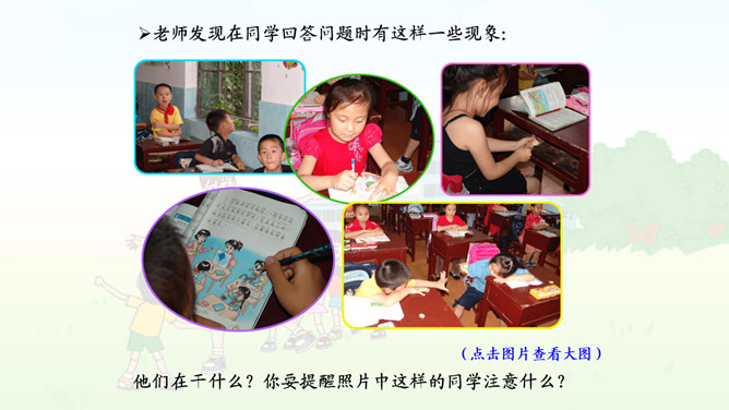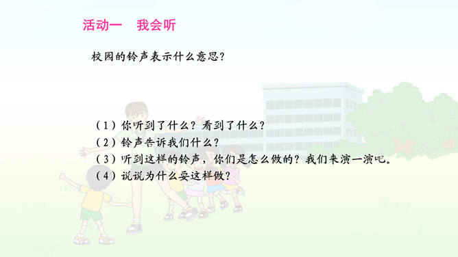 校园的铃声表示什么意思?(1)你听到了什么?看到了什么?(2)铃声告诉我们什么?(3)听到这样的铃声,你们是怎么做的?我们来演一演吧。(4)说说为什么要这样做?1.老师讲课时,应该怎么做? 2.老师提问时,应该怎么做?老师提出问题时,你们是怎么做的呢?有几个小朋友,他们是这样发言的。 你愿意向哪位小朋友学习呢,说说为什么?3.同学发言时,应该怎么做?在同学回答问题的时候,其他同学该干什么呢?老师发现在同学回答问题时有这样一些现象:他们在干什么?你要提醒照片中这样的同学注意什么?所属专题:校园里的号令ppt。