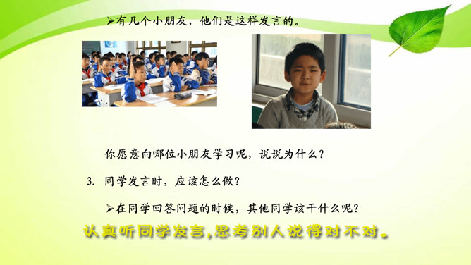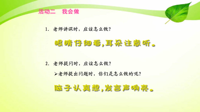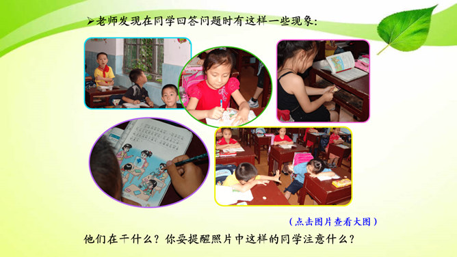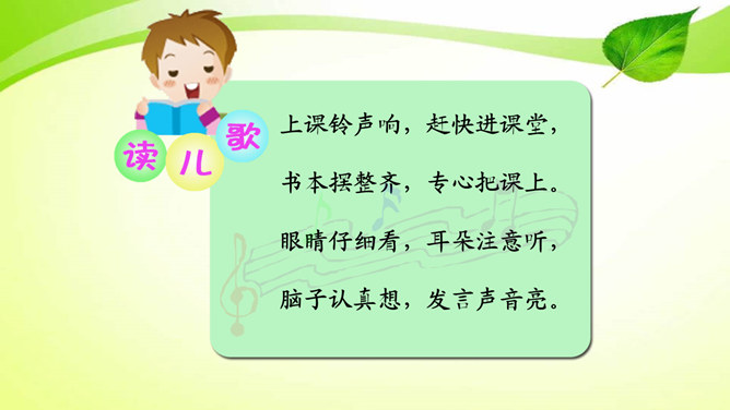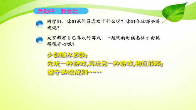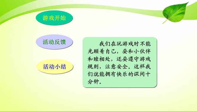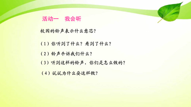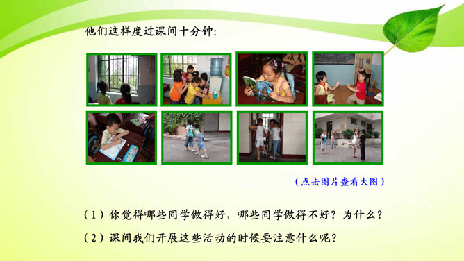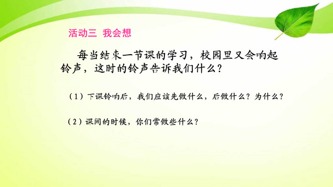 每当结束一节课的学习,校园里又会响起铃声,这时的铃声告诉我们什么?(1)下课铃响后,我们应该先做什么,后做什么?为什么?(2)课间的时候,你们常做些什么?他们这样度过课间十分钟:(1)你觉得哪些同学做得好,哪些同学做得不好?为什么?(2)课间我们开展这些活动的时候要注意什么呢?同学们,你们课间最喜欢干什么呀?你们会玩哪些游戏呢?大家都有自己喜欢的游戏,一起玩的时候怎样才会玩得很开心呢?我们在玩游戏时不能光顾着自己,要和小伙伴和睦相处,还要遵守游戏规则,注意安全。这样我们就能拥有快乐的课间十分钟。所属专题:校园里的号令ppt。