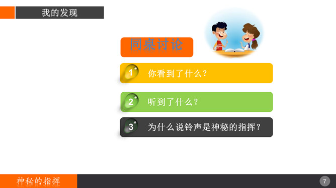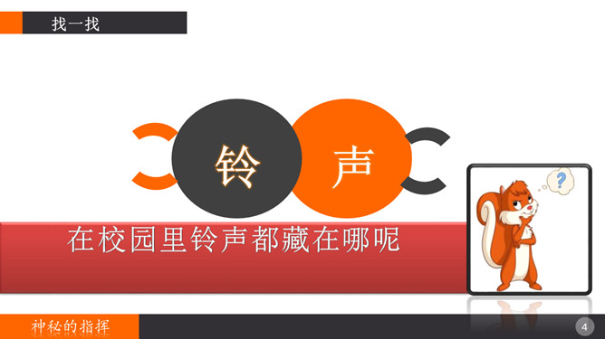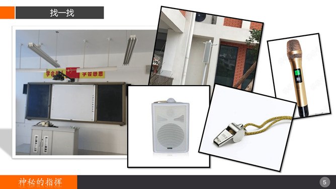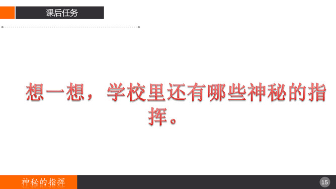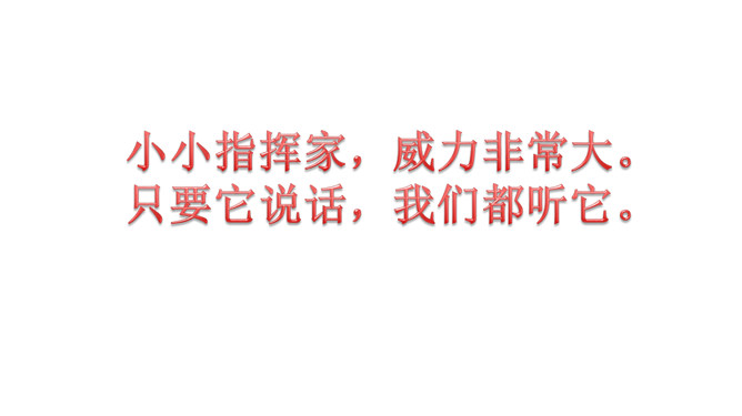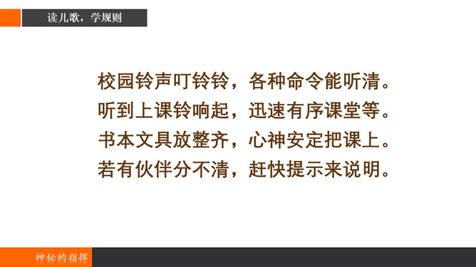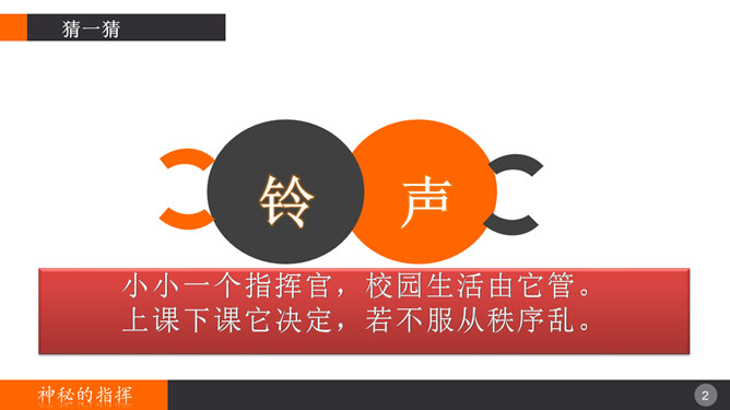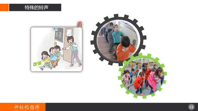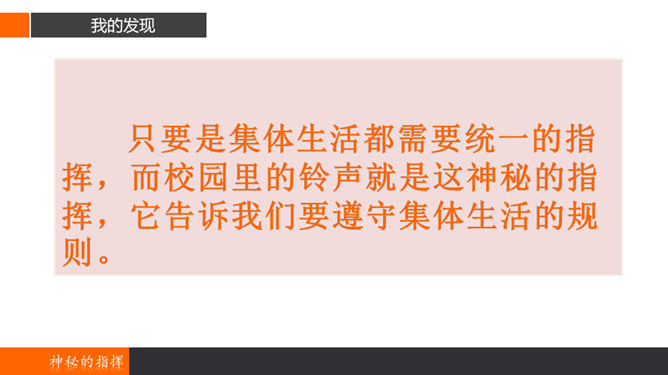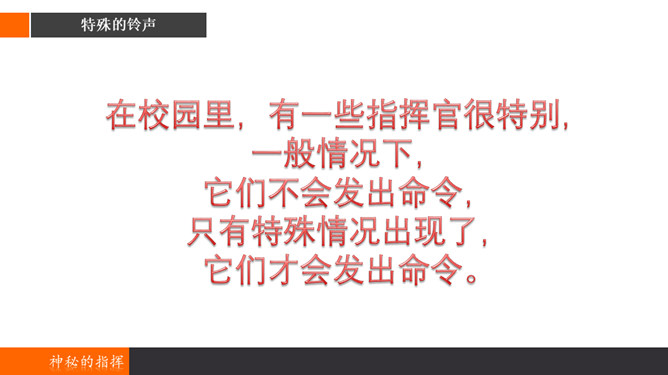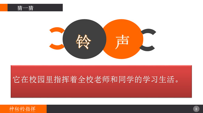 小小一个指挥官,校园生活由它管。上课下课它决定,若不服从秩序乱。它在校园里指挥着全校老师和同学的学习生活。同桌讨论:你看到了什么?听到了什么?为什么说铃声是神秘的指挥?只要是集体生活都需要统一的指挥,而校园里的铃声就是这神秘的指挥,它告诉我们要遵守集体生活的规则。在校园里,有一些指挥官很特别,一般情况下,它们不会发出命令,只有特殊情况出现了,它们才会发出命令。想一想,学校里还有哪些神秘的指挥。小小指挥家,威力非常大。只要它说话,我们都听它。所属专题:校园里的号令ppt。