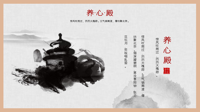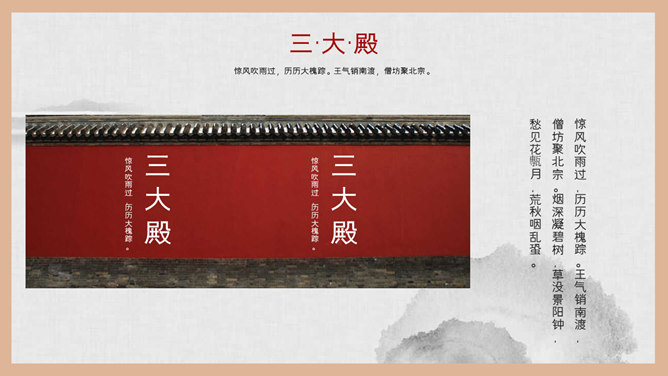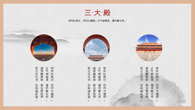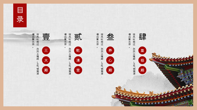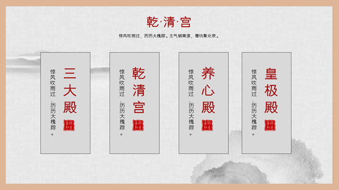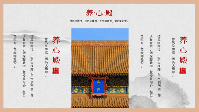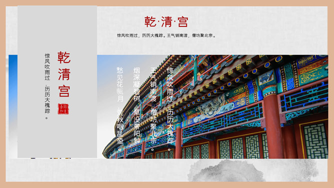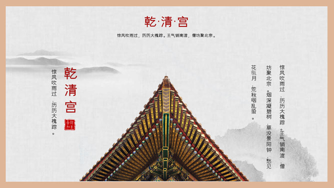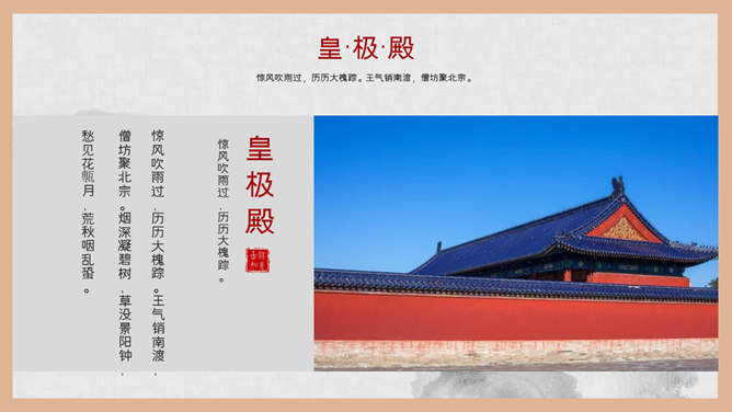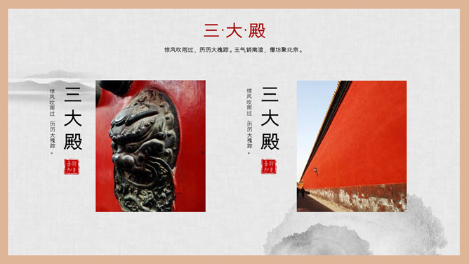 故宫建筑故宫介绍PPT模板。一套故宫主题幻灯片模板,图文排版页面为主, 设计精美,适合故宫建筑风景介绍。