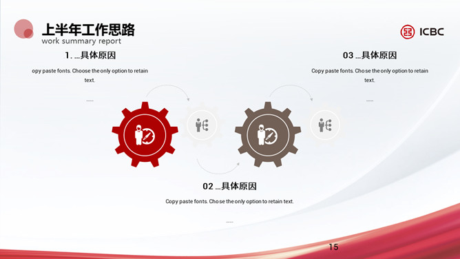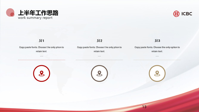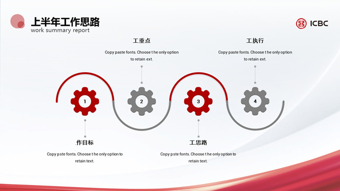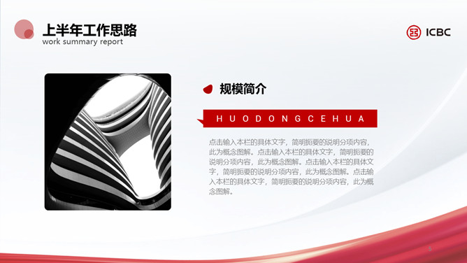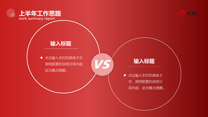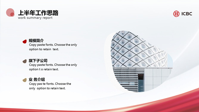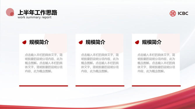 简洁工商银行专用PPT模板。一套工商银行员工专用幻灯片模板,简约设计,适合个人或部门工作汇报总结。