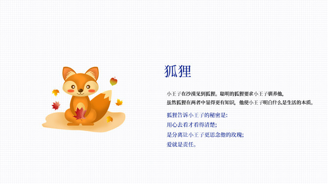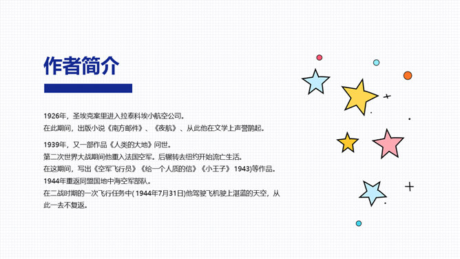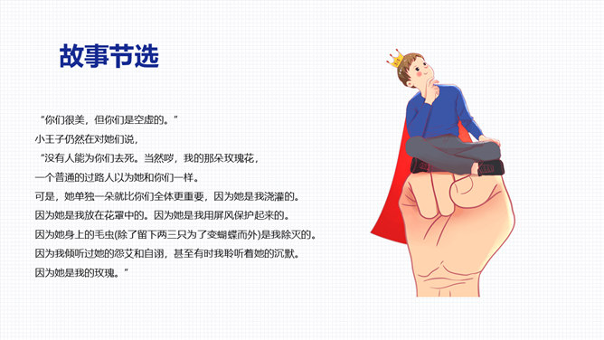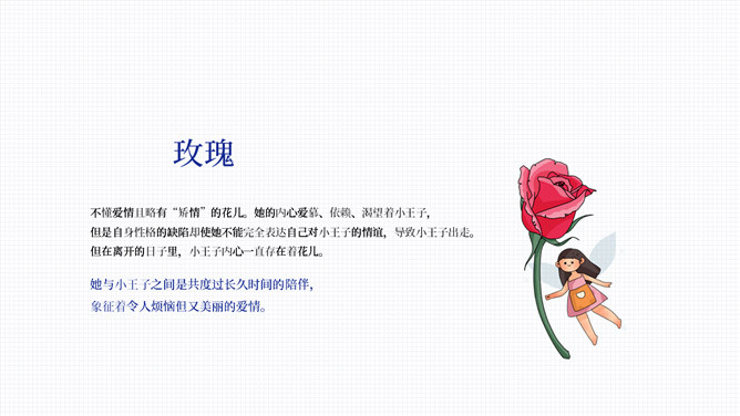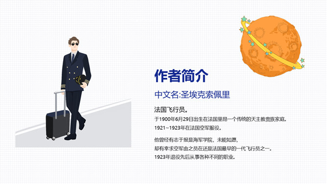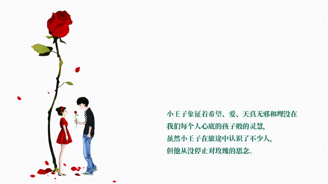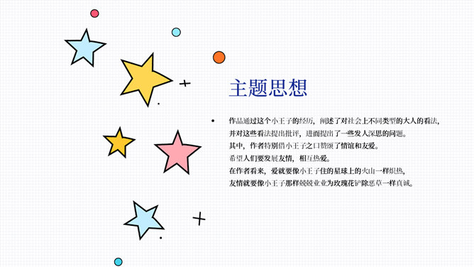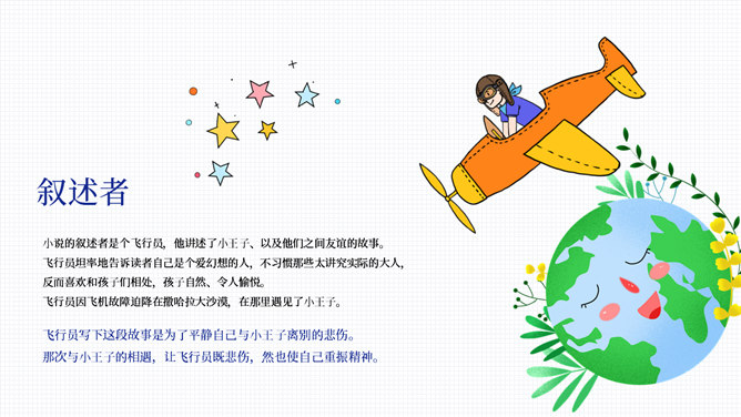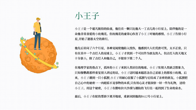 《小王子》介绍读后感PPT模板。小王子,小说就是以他命名的,是一个神秘可爱的孩子。他住在被称作B-612小星球,是那个小星球唯一居民。小王子离别自己的星球和所爱的玫瑰花开始宇宙旅行,最后来到了地球,在撒哈拉沙漠,小王子遇到小说的叙述者飞行员,并和他成了好朋友。