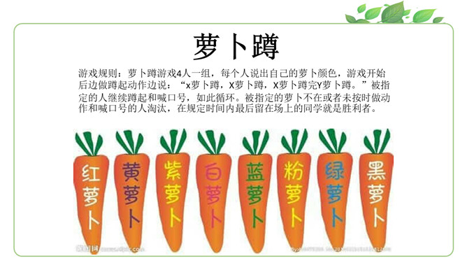 萝卜蹲游戏规则:萝卜蹲游戏4人一组,每个人说出自己的萝卜颜色,游戏开始后边做蹲起动作边说:“x萝卜蹲,X萝卜蹲,X萝卜蹲完Y萝卜蹲。”被指定的人继续蹲起和喊口号,如此循环。被指定的萝卜不在或者未按时做动作和喊口号的人淘汰,在规定时间内最后留在场上的同学就是胜利者。所属专题:课间十分钟ppt。