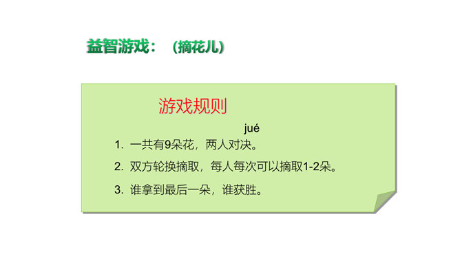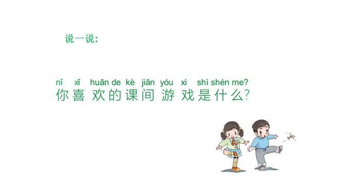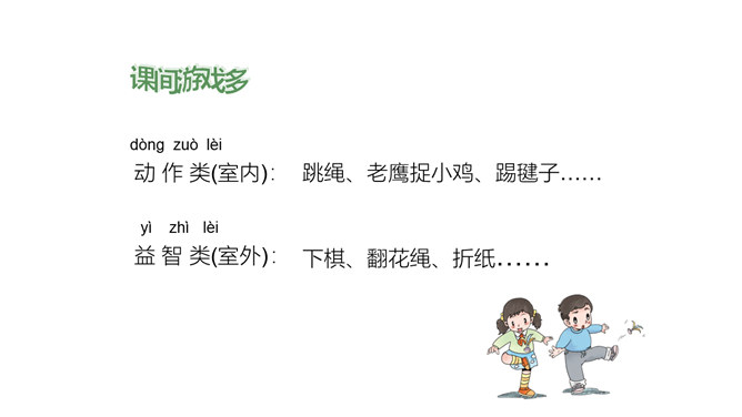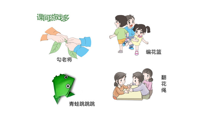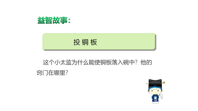 小小指挥家,威力可真大,只要它说话,我们都听它!说一说:你喜欢的课间游戏是什么?动作类(室内):跳绳、老鹰捉小鸡、踢毽子……益智类(室外):下棋、翻花绳、折纸……“捞鱼”儿歌:一网不捞鱼,二网下小雨,三网网住小尾巴鱼。这个小太监为什么能使铜板落入碗中?他的窍门在哪里?所属专题:课间十分钟ppt。