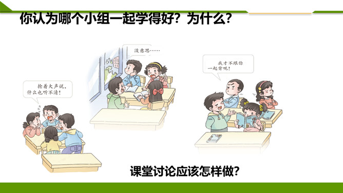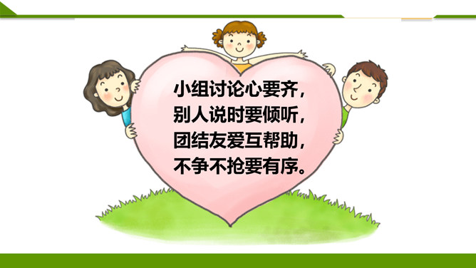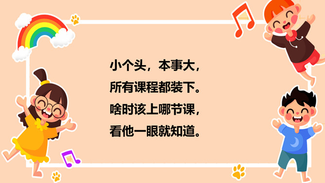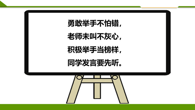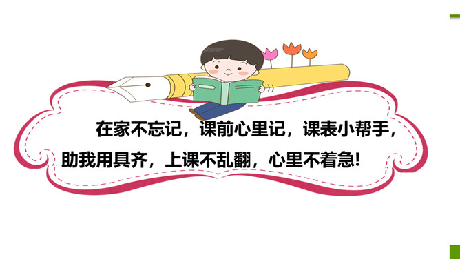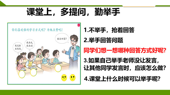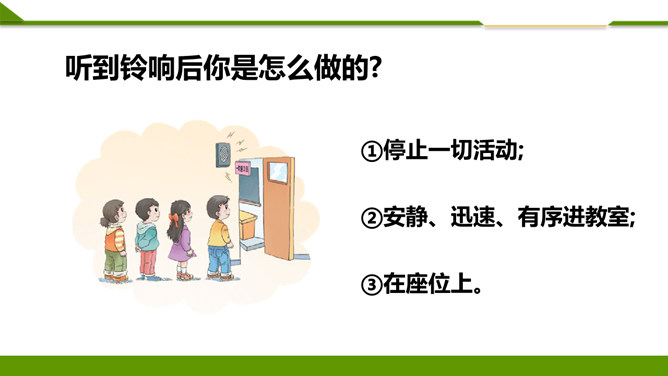 听到铃响后你是怎么做的?①停止一切活动;②安静、迅速、有序进教室;③在座位上。小个头,本事大,所有课程都装下。啥时该上哪节课,看他一眼就知道。在家不忘记,课前心里记,课表小帮手,助我用具齐,上课不乱翻,心里不着急!课堂上,多提问,勤举手:1.不举手,抢着回答。2.举手回答问题。同学们想一想哪种回答方式好呢?3.如果自己举手老师没让发言,让其他同学发言时,应该怎么做?4.课堂上什么时候可以举手呢?你认为哪个小组一起学得好?为什么?课堂讨论应该怎样做?所属专题:上课了ppt。