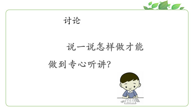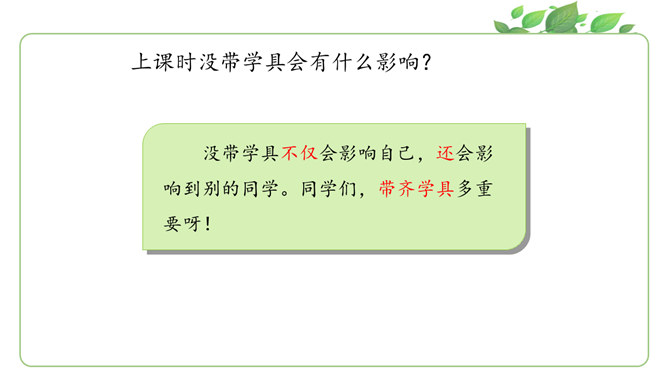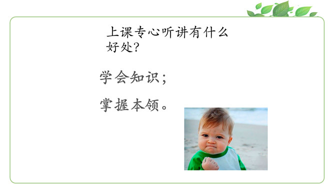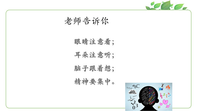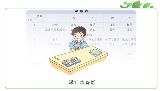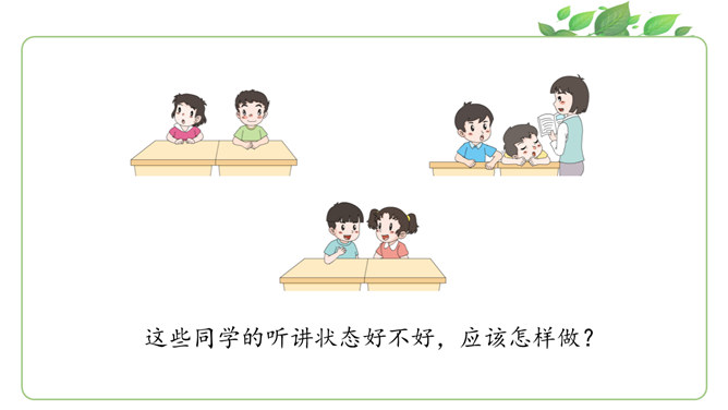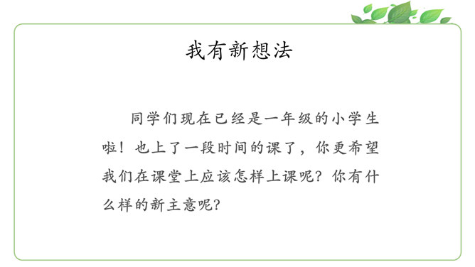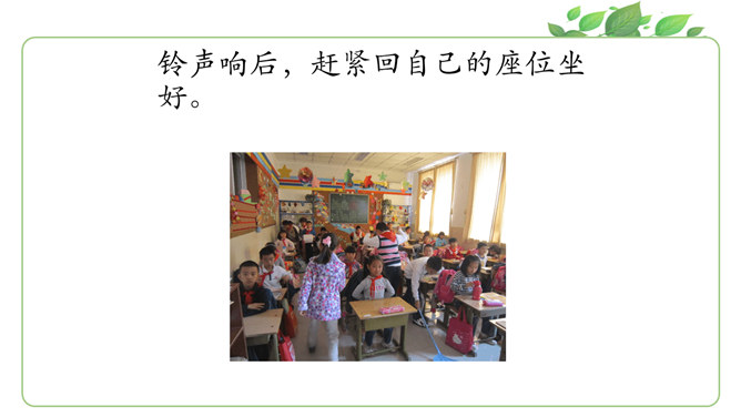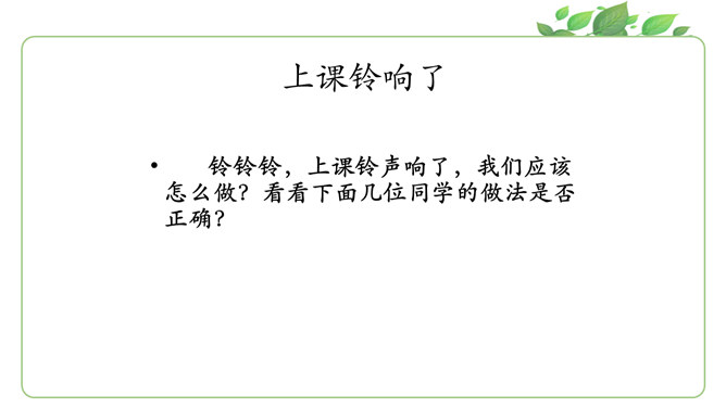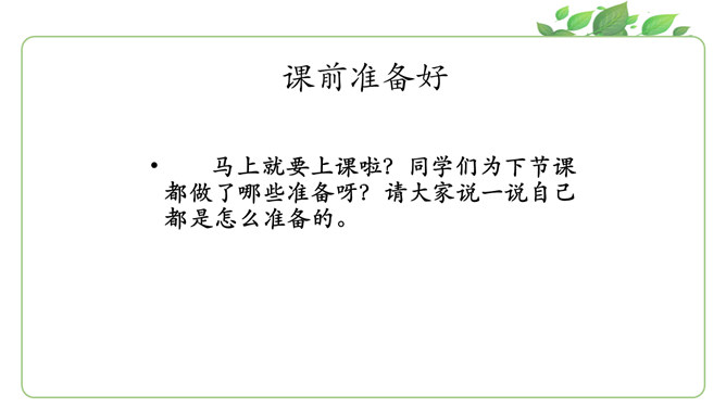 马上就要上课啦?同学们为下节课都做了哪些准备呀?请大家说一说自己都是怎么准备的。同学们现在已经是一年级的小学生啦!也上了一段时间的课了,你更希望我们在课堂上应该怎样上课呢?你有什么样的新主意呢?铃铃铃,上课铃声响了,我们应该怎么做?看看下面几位同学的做法是否正确?铃声响后,赶紧回自己的座位坐好。你觉得一个人独自学习好,还是更愿意和大家一起学习?在我们进行小组讨论时,既要每一个同学都参与,也要保证小组成员间的友好相处,所以一定要注意倾听其他同学的发言。所属专题:上课了ppt。