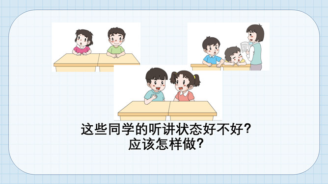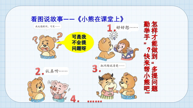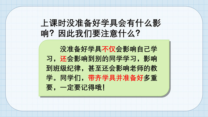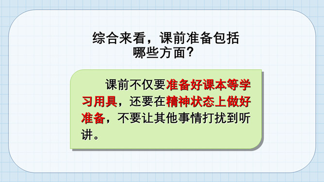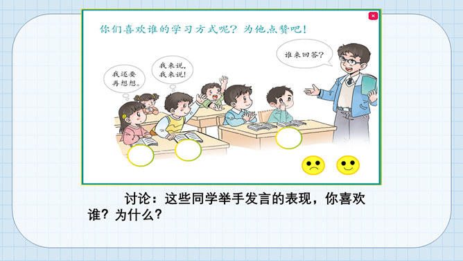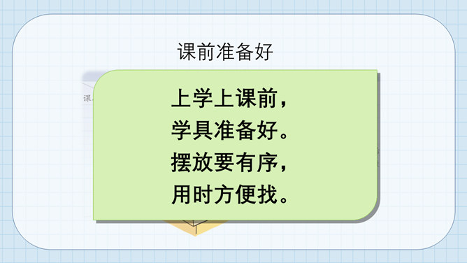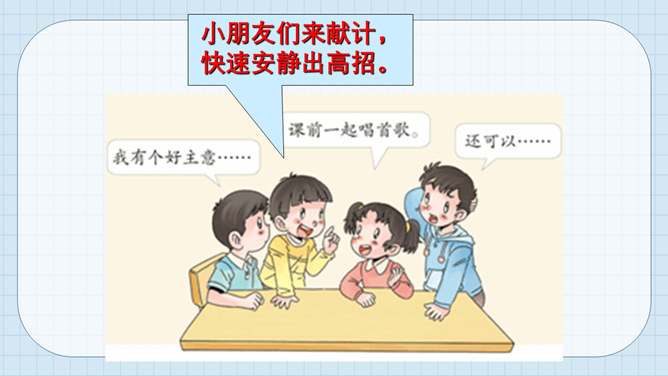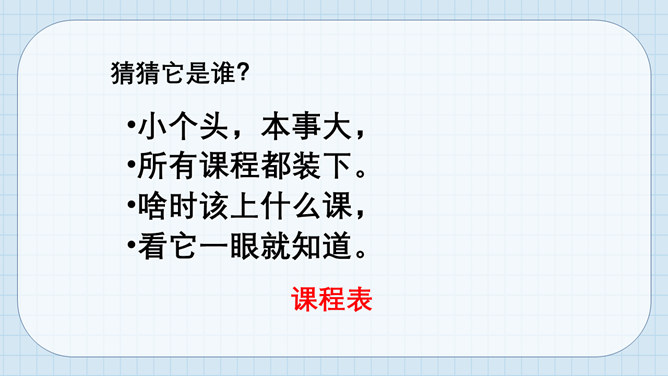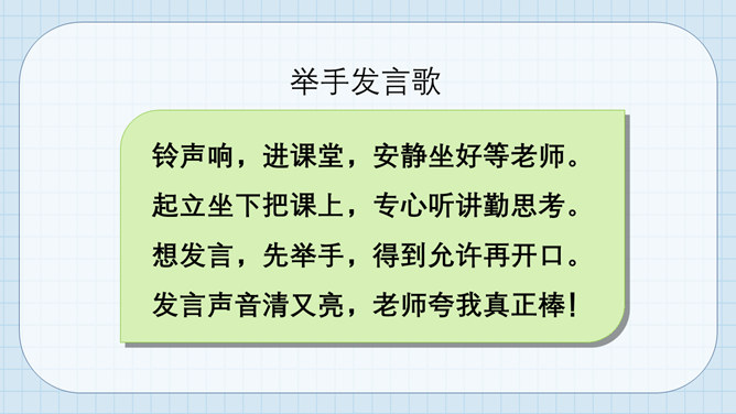 猜猜它是谁?小个头,本事大,所有课程都装下。啥时该上什么课,看它一眼就知道。课程表。举手发言歌:铃声响,进课堂,安静坐好等老师。起立坐下把课上,专心听讲勤思考。想发言,先举手,得到允许再开口。 发言声音清又亮,老师夸我真正棒!小朋友们来献计,快速安静出高招。所属专题:上课了ppt。