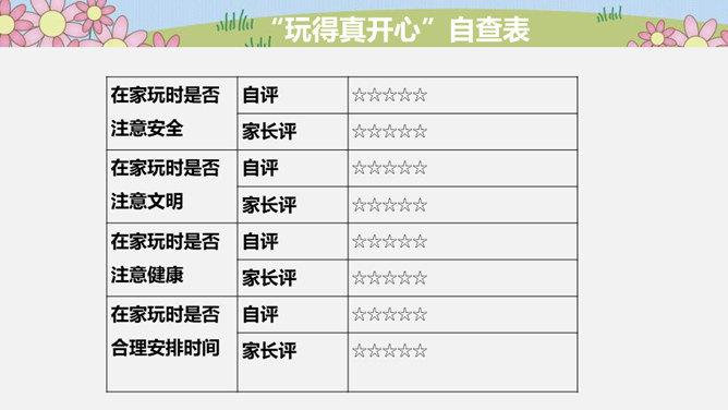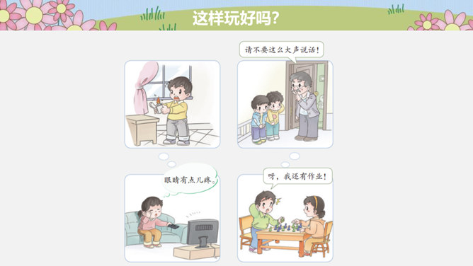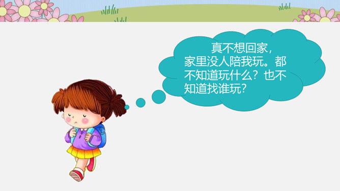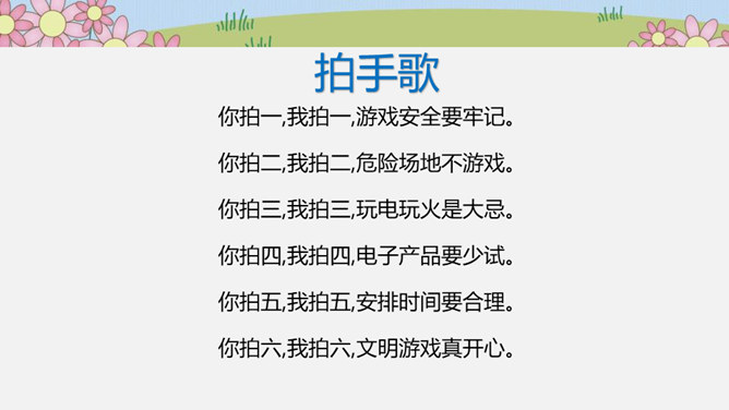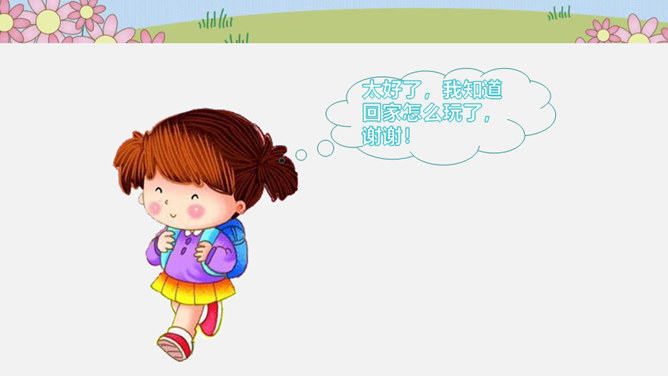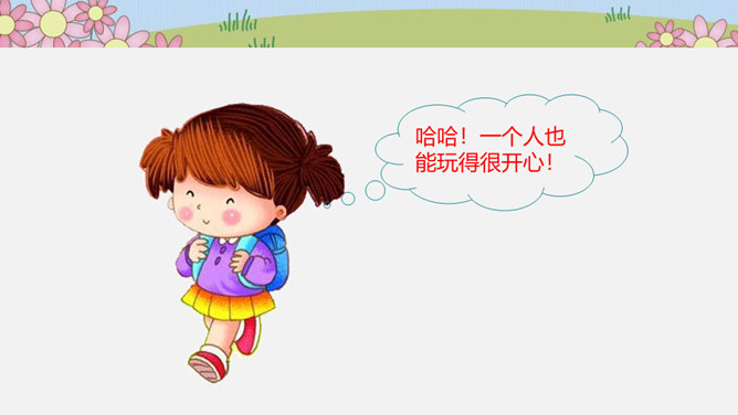 放学啦!真不想回家,家里没人陪我玩。都不知道玩什么?也不知道找谁玩?哈哈!一个人也能玩得很开心!太好了,我知道回家怎么玩了,谢谢!家中还有哪些东西可以拿来玩?你拍一,我拍一,游戏安全要牢记。你拍二,我拍二,危险场地不游戏。你拍三,我拍三,玩电玩火是大忌。你拍四,我拍四,电子产品要少试。你拍五,我拍五,安排时间要合理。你拍六,我拍六,文明游戏真开心。所属专题:玩得真开心ppt。