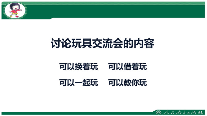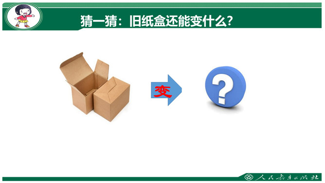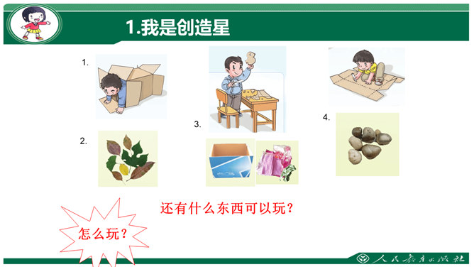 活动一 小小毽子也快乐。活动二 物品玩出新花样。我是创造星。怎么玩?还有什么东西可以玩?想一想 看一看。猜一猜:旧纸盒还能变什么?试一试,学做树叶贴画。美丽的叶画。活动四 开个玩具交流会。讨论玩具交流会的内容。可以换着玩。可以借着玩。所属专题:玩得真开心ppt。