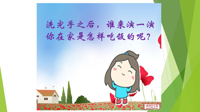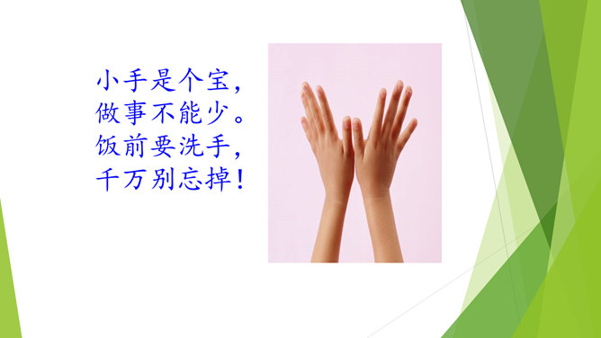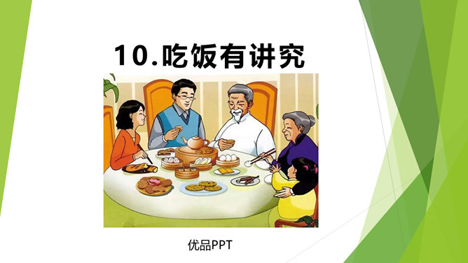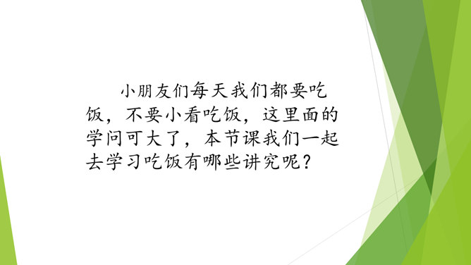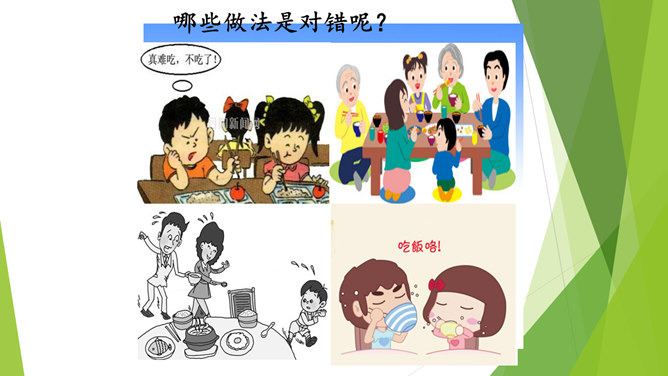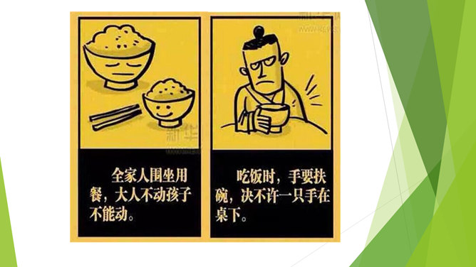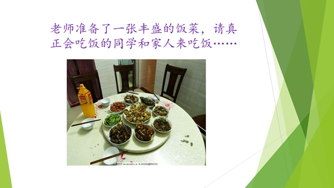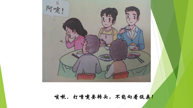 小朋友们每天我们都要吃饭,不要小看吃饭,这里面的学问可大了,本节课我们一起去学习吃饭有哪些讲究呢?老师准备了一张丰盛的饭菜,请真正会吃饭的同学和家人来吃饭……小朋友,你会吃饭吗?显微镜下没洗过的手。怎样洗手才干净呢?用香皂,洗手液洗洗更干净哦!清水冲洗更干净!小手是个宝,做事不能少。饭前要洗手,千万别忘掉!洗完手之后,谁来演一演你在家是怎样吃饭的呢?哪些做法是对错呢?咳嗽、打喷嚏要转头,不能向着饭桌!讲卫生,懂礼仪,一家人幸福地一起吃饭!所属专题:吃饭有讲究ppt。