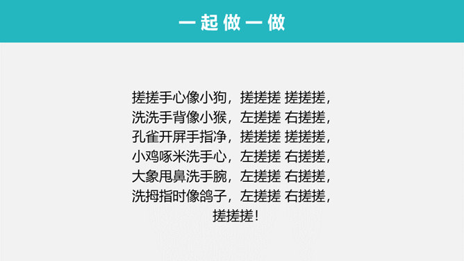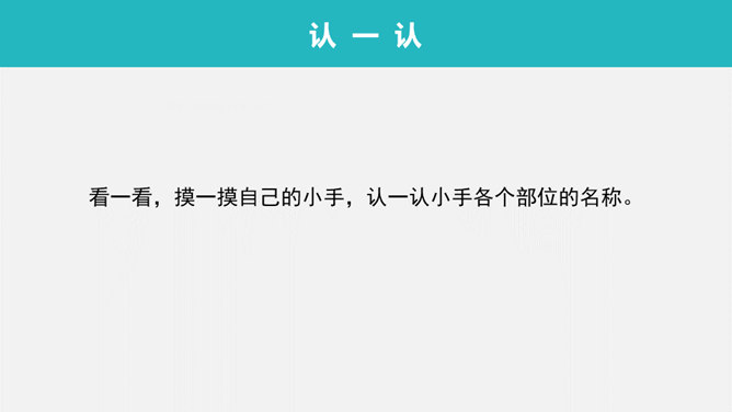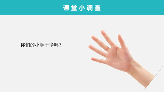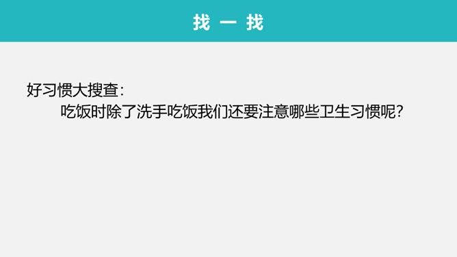 看一看,摸一摸自己的小手,认一认小手各个部位的名称。你们的小手干净吗?好习惯大搜查:吃饭时除了洗手吃饭我们还要注意哪些卫生习惯呢?1、仔细的观察卡片。2、将正确的用餐礼仪排一排,说一说。3、注意友好、快速、正确。所属专题:吃饭有讲究ppt。