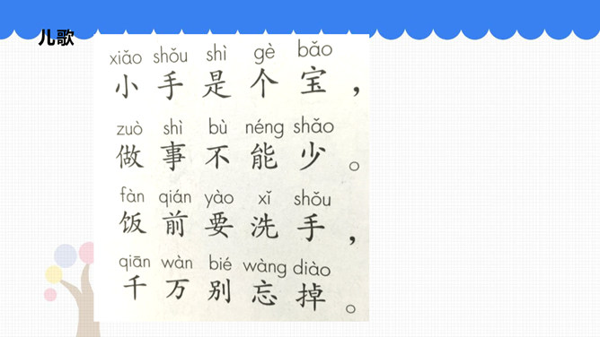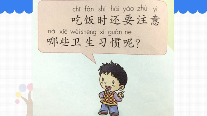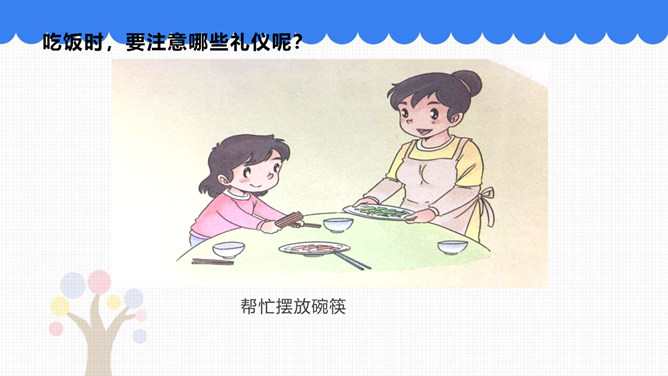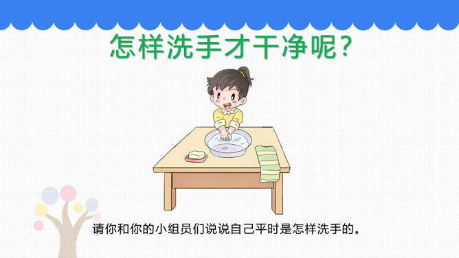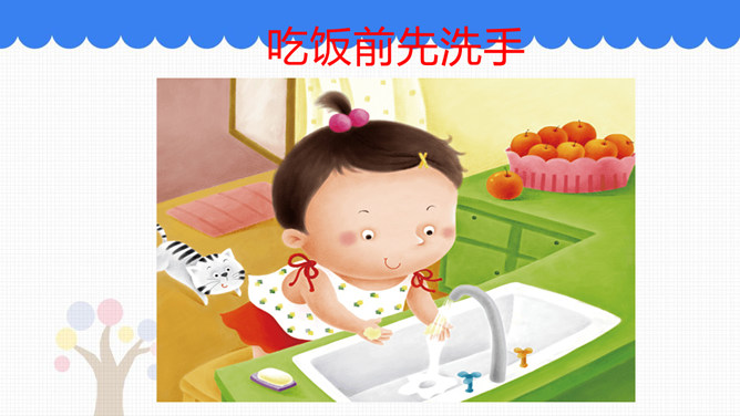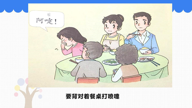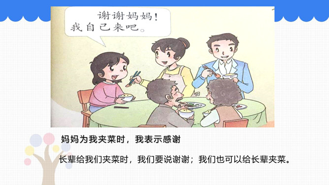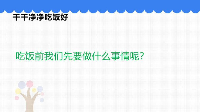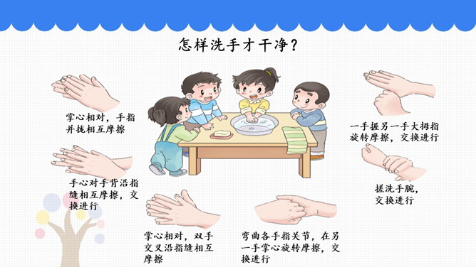 吃饭前我们先要做什么事情呢?吃饭前先洗手。怎样洗手才干净呢?请你和你的小组员们说说自己平时是怎样洗手的。怎样洗手才干净?掌心相对,手指并拢相互摩擦。手心对手背沿指缝相互摩擦,交换进行。掌心相对,双手交叉沿指缝相互摩擦。弯曲各手指关节,在另一手掌心旋转摩擦,交换进行。搓洗手腕,交换进行。一手握另一手大拇指旋转摩擦,交换进行。吃饭时,要注意哪些礼仪呢?要背对着餐桌打喷嚏。妈妈为我夹菜时,我表示感谢。长辈给我们夹菜时,我们要说谢谢;我们也可以给长辈夹菜。所属专题:吃饭有讲究ppt。