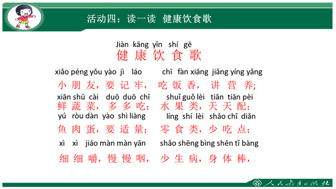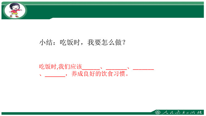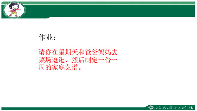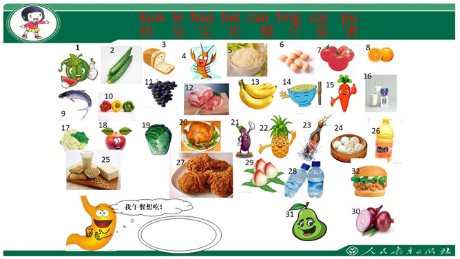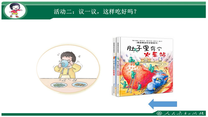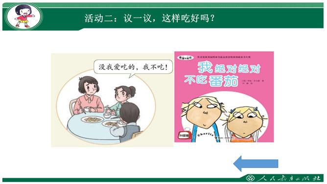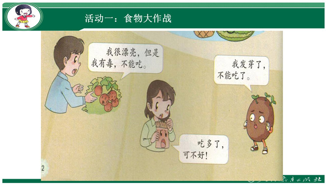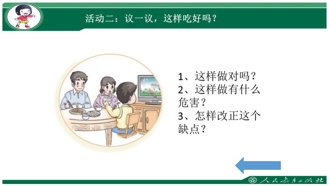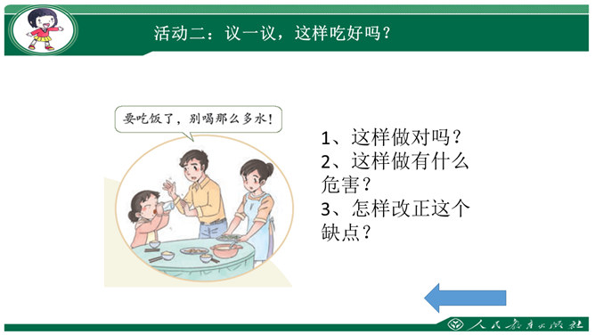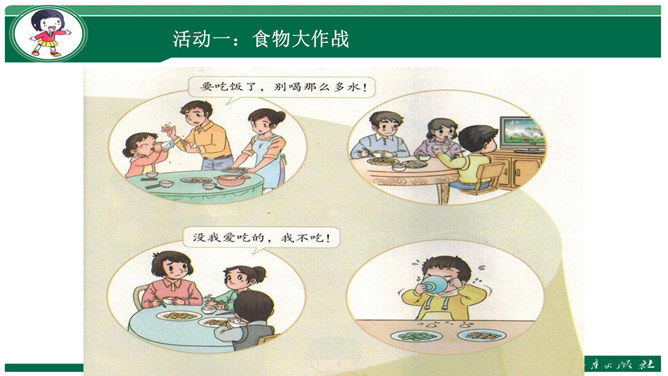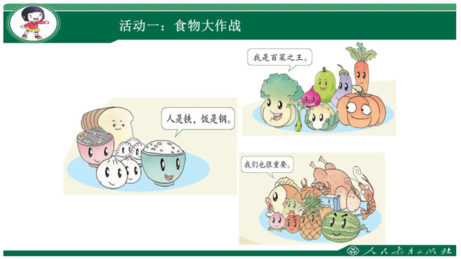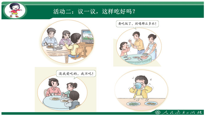 活动一:食物大作战。活动二:议一议,这样吃好吗?1、这样做对吗?2、这样做有什么危害?3、怎样改正这个缺点?小结:吃饭时,我要怎么做?作业:请你在星期天和爸爸妈妈去菜场逛逛,然后制定一份一周的家庭菜谱。所属专题:吃饭有讲究ppt。