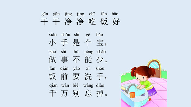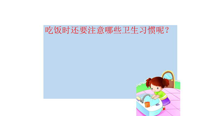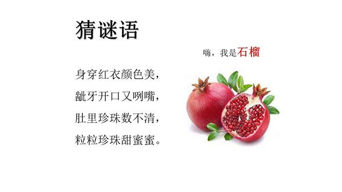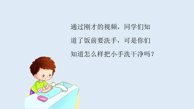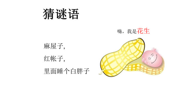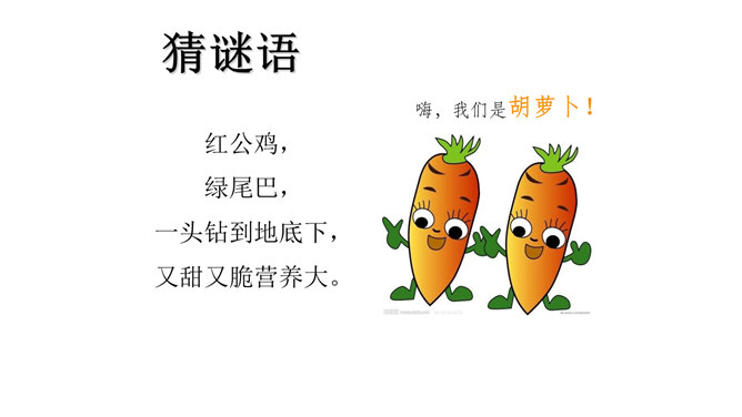 猜谜语:红公鸡,绿尾巴,一头钻到地底下,又甜又脆营养大。嗨,我们是胡萝卜!猜谜语:麻屋子,红帐子,里面睡个白胖子。嗨,我是花生。猜谜语:身穿红衣颜色美, 龇牙开口又咧嘴, 肚里珍珠数不清, 粒粒珍珠甜蜜蜜。嗨,我是石榴。通过刚才的视频,同学们知道了饭前要洗手,可是你们知道怎么样把小手洗干净吗?小动物教你六步洗手法。吃饭时还要注意哪些卫生习惯呢?所属专题:吃饭有讲究ppt。