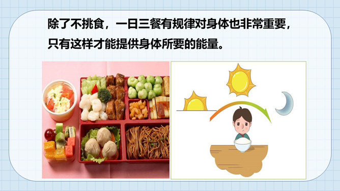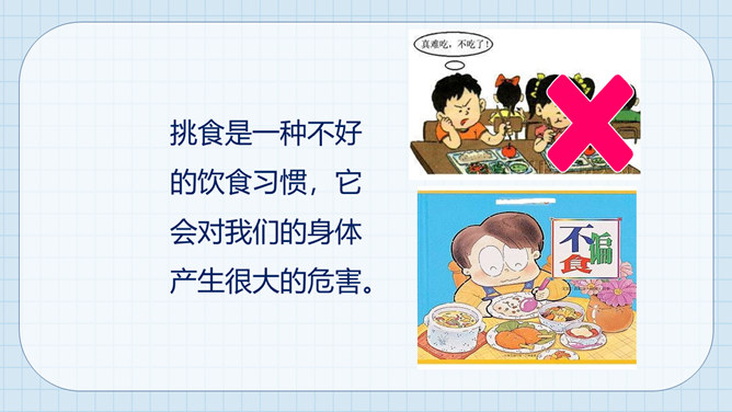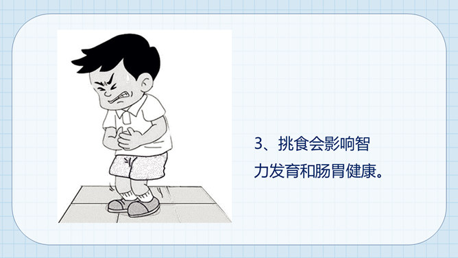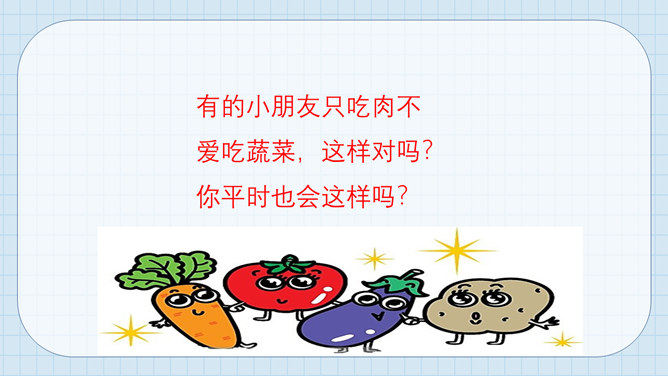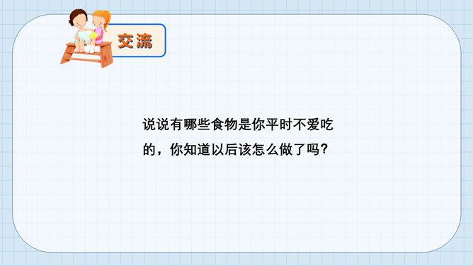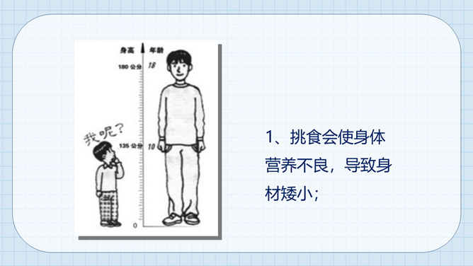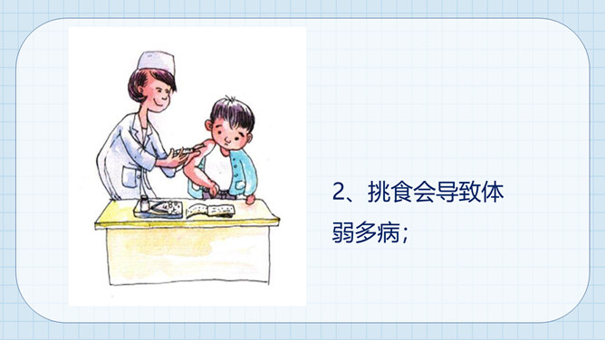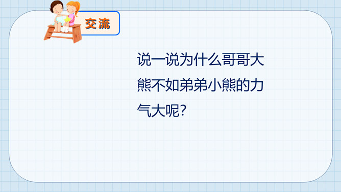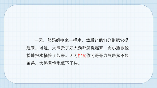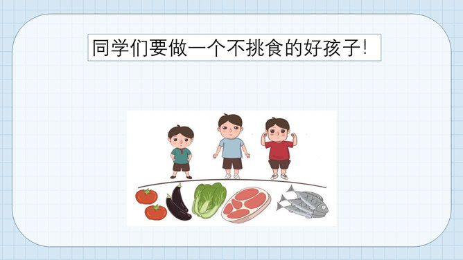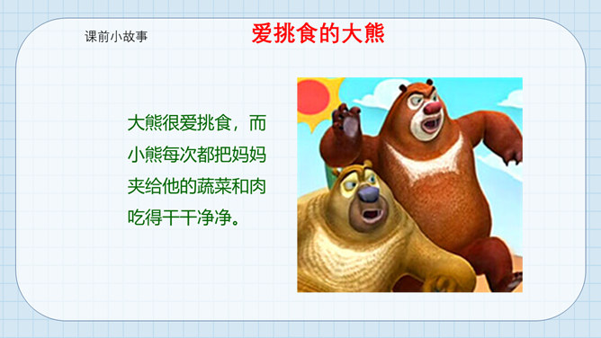 大熊很爱挑食,而小熊每次都把妈妈夹给他的蔬菜和肉吃得干干净净。一天,熊妈妈拎来一桶水,然后让他们分别把它提起来。可是,大熊费了好大劲都没提起来,而小熊很轻松地把水桶拎了起来。因为挑食作为哥哥力气居然不如弟弟,大熊羞愧地低下了头。说一说为什么哥哥大熊不如弟弟小熊的力气大呢?挑食是一种不好的饮食习惯,它会对我们的身体产生很大的危害。1、挑食会使身体营养不良,导致身材矮小;2、挑食会导致体弱多病;3、挑食会影响智力发育和肠胃健康。有的小朋友只吃肉不爱吃蔬菜,这样对吗?你平时也会这样吗?所属专题:吃饭有讲究ppt。