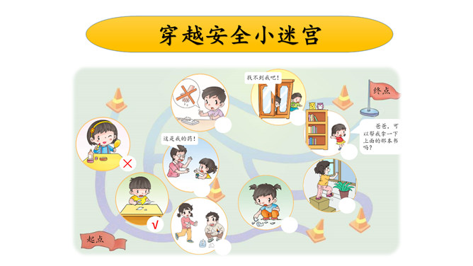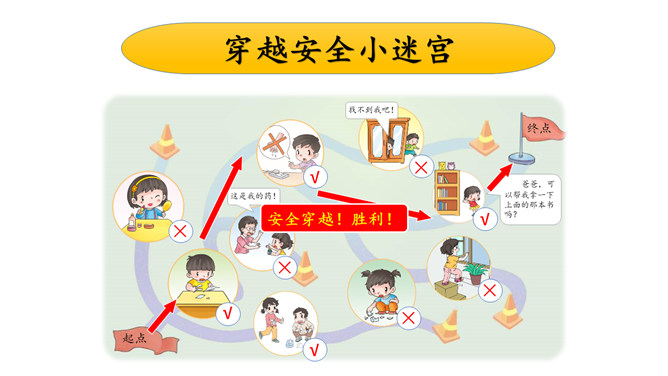 同学们,你在家里做过危险的事情吗?迷宫里有许多障碍,在这些障碍处我们要进行安全行为和危险行为的判断,安全的障碍处我们可以顺利通行,危险的障碍处不可以通行哦!我们的生活中还有哪些不安全的事情呢?受伤了怎么办?我们下次再一起讨论学习吧!小朋友们,再见!所属专题:别伤着自己ppt。