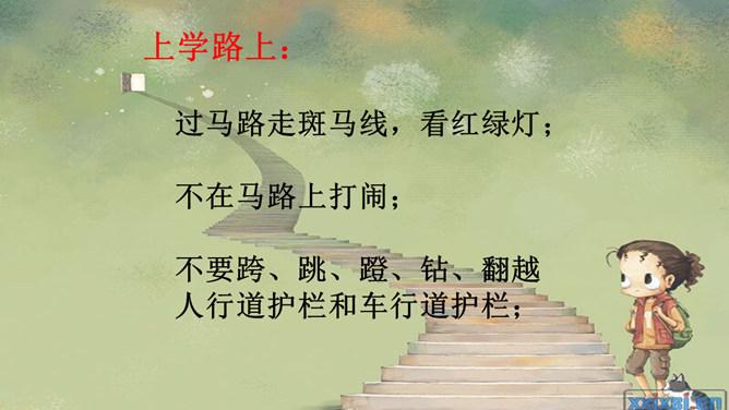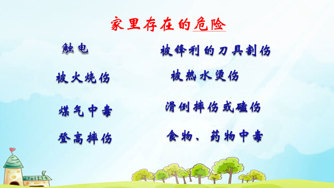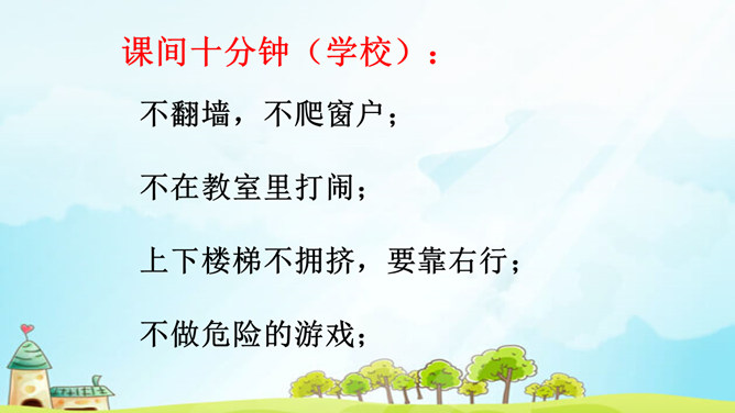 上学路上:过马路走斑马线,看红绿灯;不在马路上打闹;不要跨、跳、蹬、钻、翻越人行道护栏和车行道护栏;课间十分钟(学校):不翻墙,不爬窗户;不在教室里打闹;上下楼梯不拥挤,要靠右行;不做危险的游戏;想一想:在家里可能会有什么危险发生?议一议:四人一组讨论,在家中还有哪些安全隐患,怎样做才安全?所属专题:别伤着自己ppt。