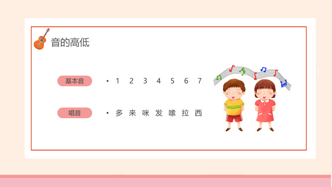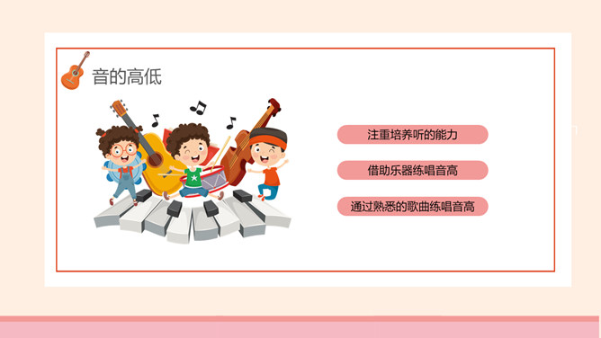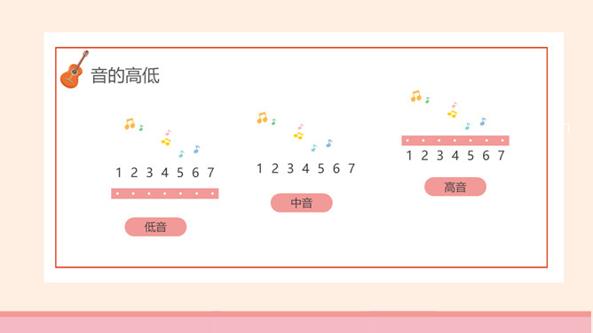 乐谱乐理基础知识PPT模板。包括音的高低、音的长短、音的强弱、常用记号、调号与定号几个部分内容。