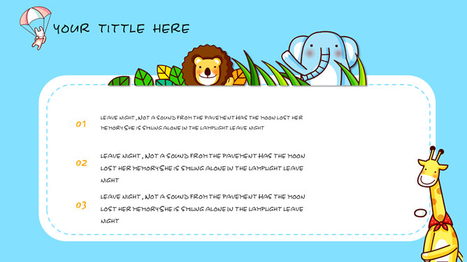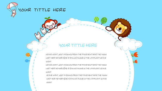 卡通可爱小动物PPT模板。一套卡通风格幻灯片模板,可爱小动物装饰,蓝色背景,适合幼儿课件等内容。