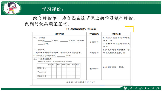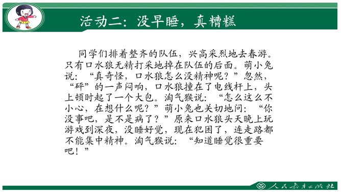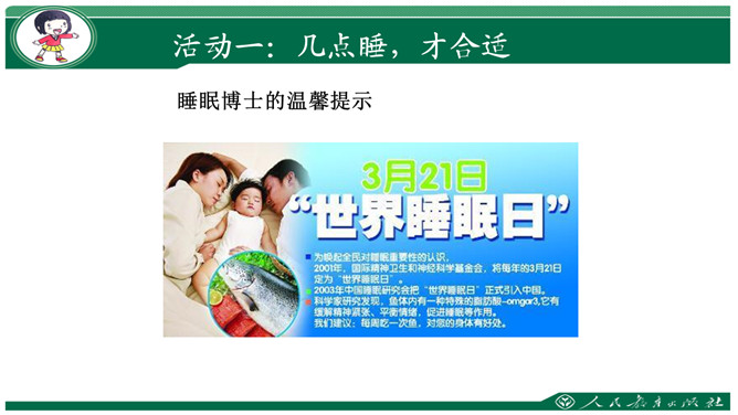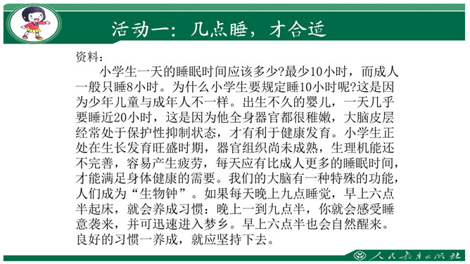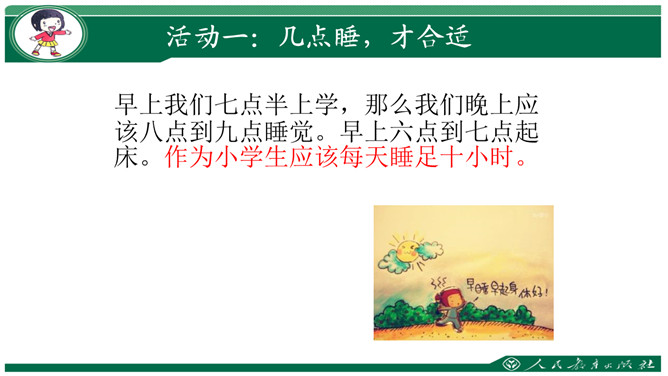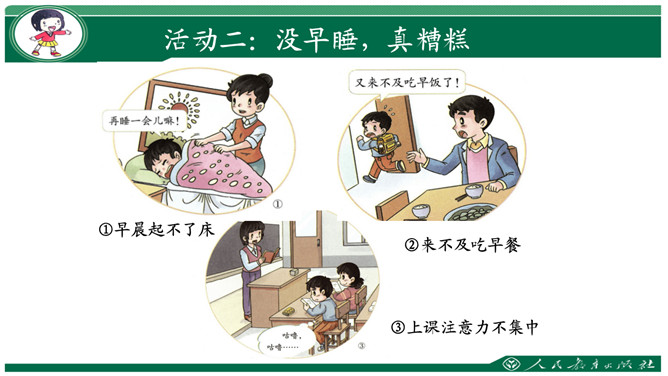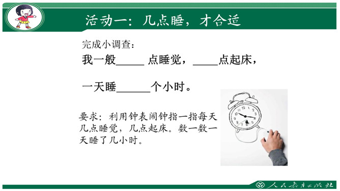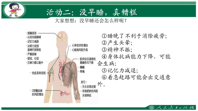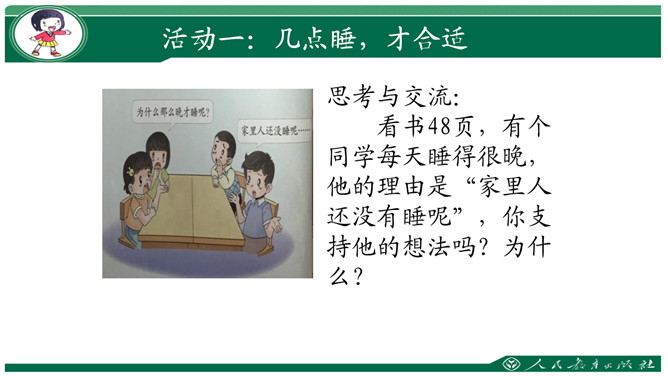 要求:利用钟表闹钟指一指每天几点睡觉,几点起床。数一数一天睡了几小时。思考与交流:看书48页,有个同学每天睡得很晚,他的理由是“家里人还没有睡呢”,你支持他的想法吗?为什么?早上我们七点半上学,那么我们晚上应该八点到九点睡觉。早上六点到七点起床。作为小学生应该每天睡足十小时。大家想想:没早睡还会怎么样呢?①睡晚了不利于消除疲劳;②产生头晕;③精神不振;④身体抗病能力下降,可能会生病;⑤记忆力减退;⑥着急赶路可能会出交通意外。所属专题:早睡早起ppt。