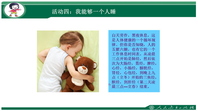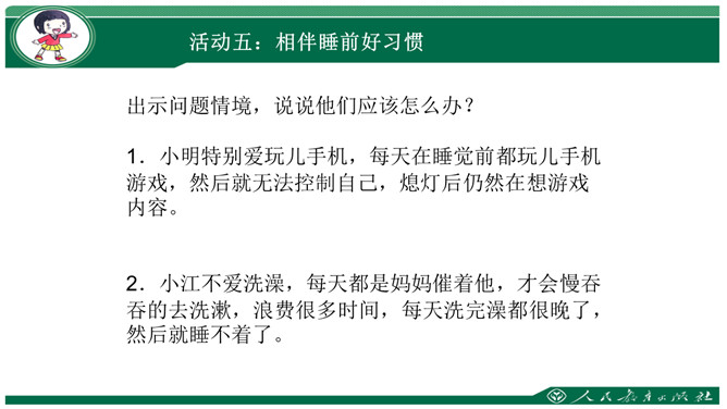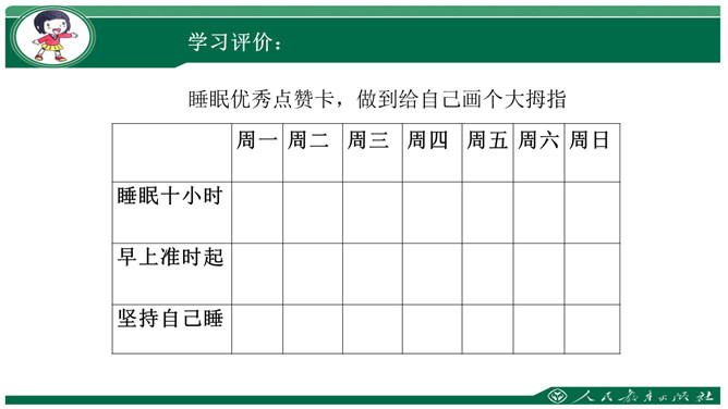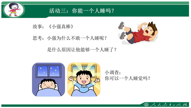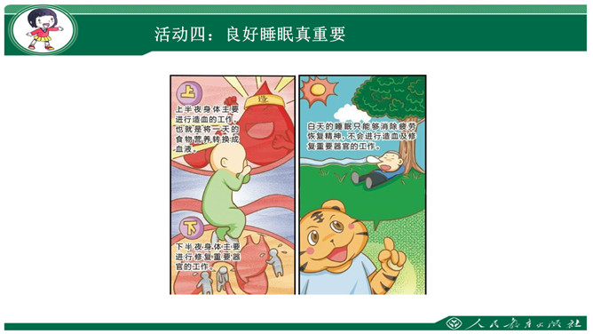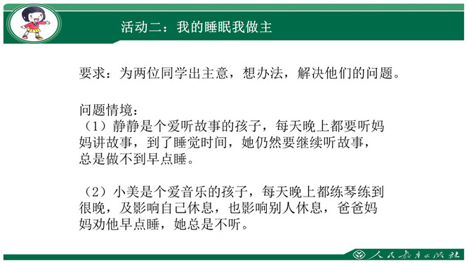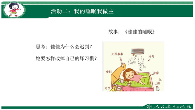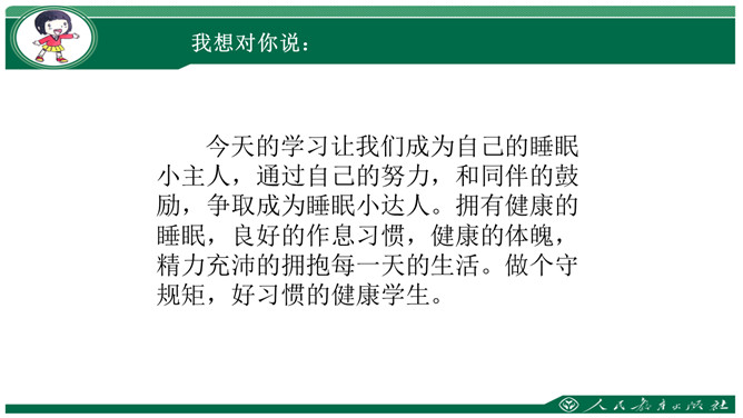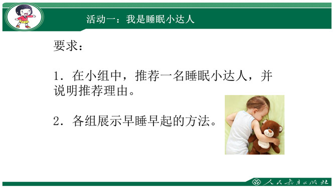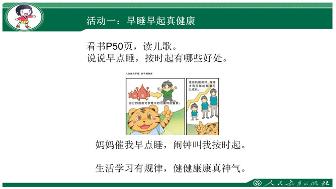 要求:在小组中,推荐一名睡眠小达人,并说明推荐理由。各组展示早睡早起的方法。读儿歌。说说早点睡,按时起有哪些好处。妈妈催我早点睡,闹钟叫我按时起。生活学习有规律,健健康康真神气。思考:佳佳为什么会迟到?她要怎样改掉自己的坏习惯?要求:为两位同学出主意,想办法,解决他们的问题。今天的学习让我们成为自己的睡眠小主人,通过自己的努力,和同伴的鼓励,争取成为睡眠小达人。拥有健康的睡眠,良好的作息习惯,健康的体魄,精力充沛的拥抱每一天的生活。做个守规矩,好习惯的健康学生。所属专题:早睡早起ppt。