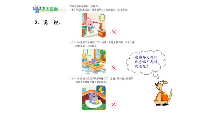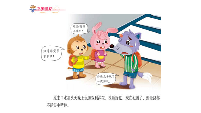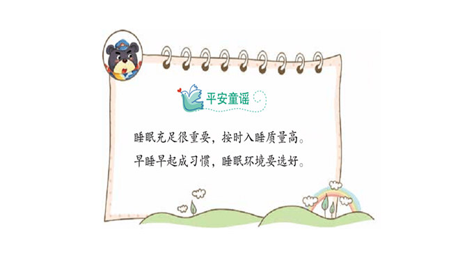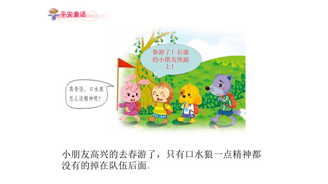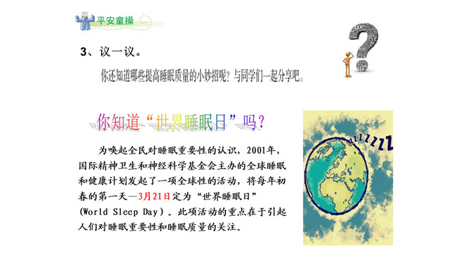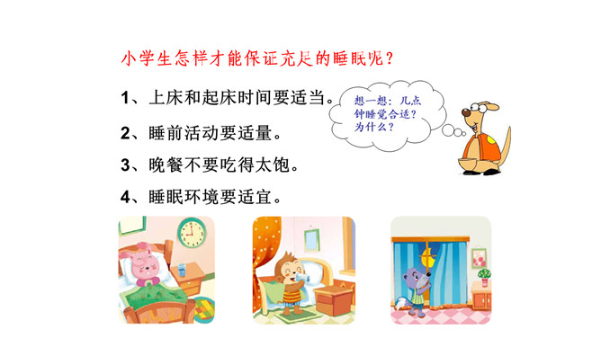 春游了!后面的小朋友快跟上!小朋友高兴的去春游了,只有口水狼一点精神都没有的掉在队伍后面。小学生怎样才能保证充足的睡眠呢?想一想:几点钟睡觉合适?为什么?1、上床和起床时间要适当。2、睡前活动要适量。3、晚餐不要吃得太饱。4、睡眠环境要适宜。这些坏习惯你也有吗?怎样改进呢?你知道“世界睡眠日”吗?所属专题:早睡早起ppt。