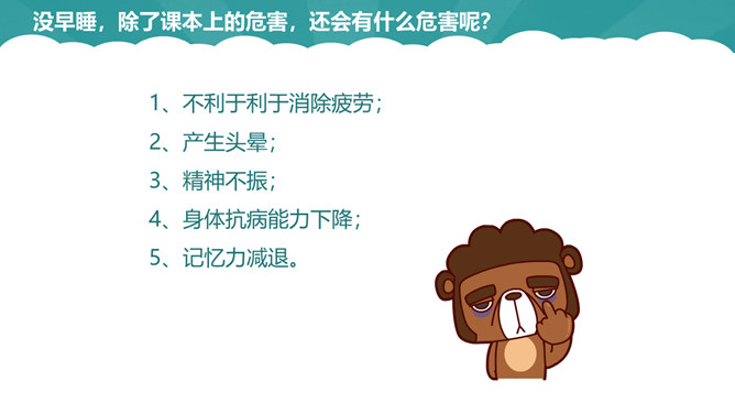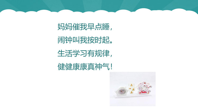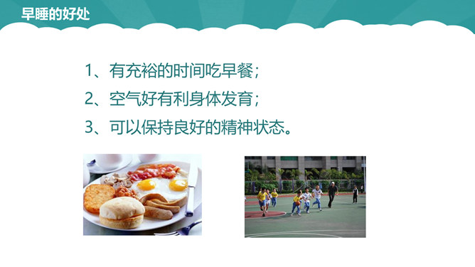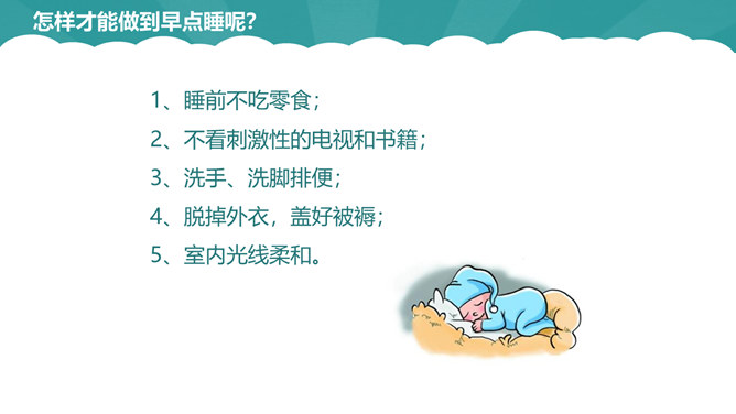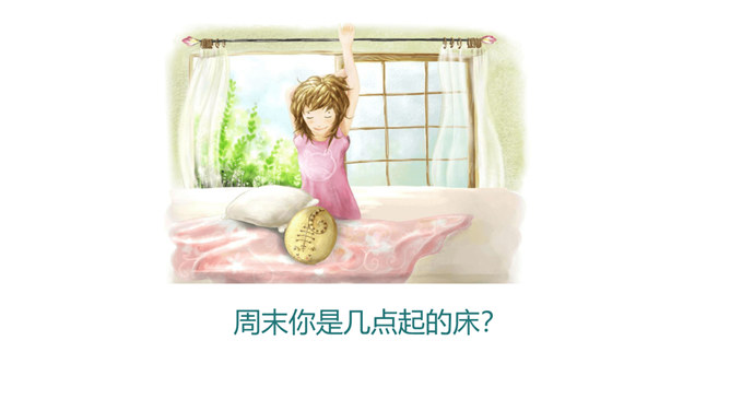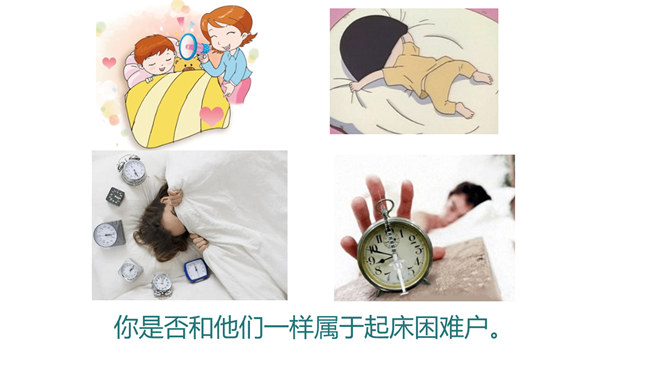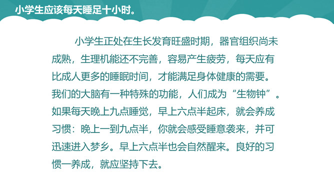 几点睡,才合适。周末你是几点起的床?你是否和他们一样属于起床困难户。小学生正处在生长发育旺盛时期,器官组织尚未成熟,生理机能还不完善,容易产生疲劳,每天应有比成人更多的睡眠时间,才能满足身体健康的需要。我们的大脑有一种特殊的功能,人们成为“生物钟”。如果每天晚上九点睡觉,早上六点半起床,就会养成习惯:晚上一到九点半,你就会感受睡意袭来,并可迅速进入梦乡。早上六点半也会自然醒来。良好的习惯一养成,就应坚持下去。早睡的好处:有充裕的时间吃早餐;空气好有利身体发育;可以保持良好的精神状态。所属专题:早睡早起ppt。