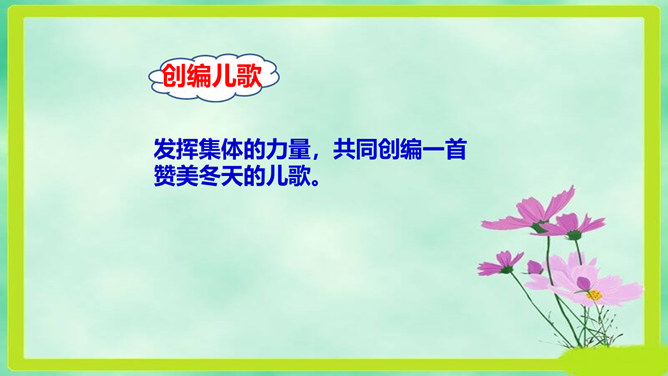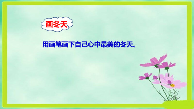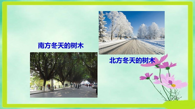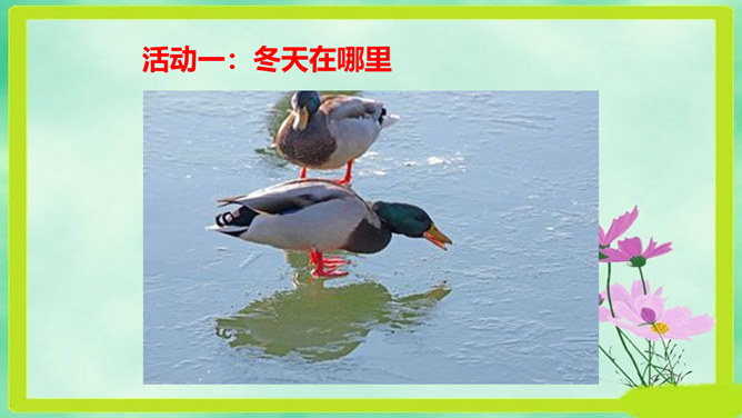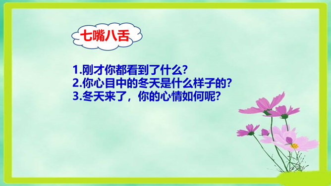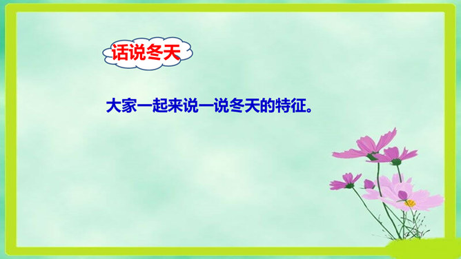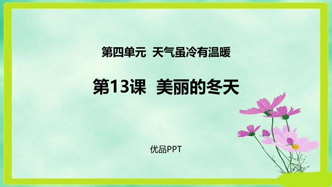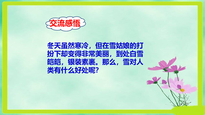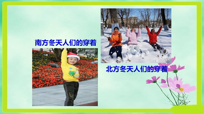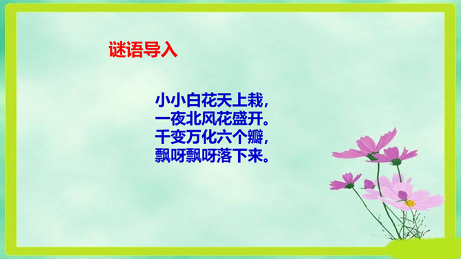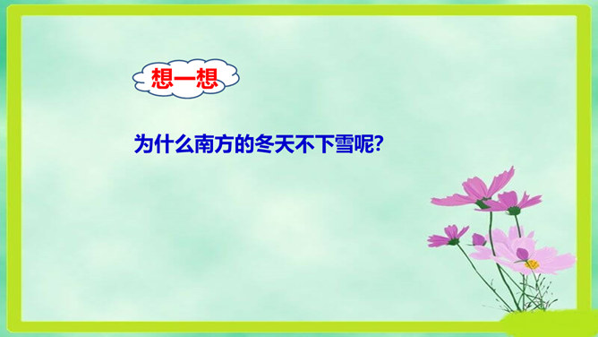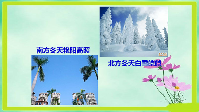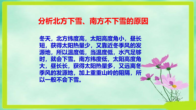 小小白花天上栽,一夜北风花盛开。千变万化六个瓣,飘呀飘呀落下来。1.刚才你都看到了什么?2.你心目中的冬天是什么样子的?3.冬天来了,你的心情如何呢?大家一起来说一说冬天的特征。冬天虽然寒冷,但在雪姑娘的打扮下却变得非常美丽,到处白雪皑皑,银装素裹。那么,雪对人类有什么好处呢?发挥集体的力量,共同创编一首赞美冬天的儿歌。为什么南方的冬天不下雪呢?冬天,北方纬度高,太阳高度角小,昼长短,获得太阳热量少,又靠近冬季风的发源地,所以温度低,当温度低,水汽足够时,就会下雪。所属专题:美丽的冬天ppt。