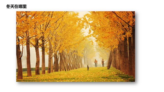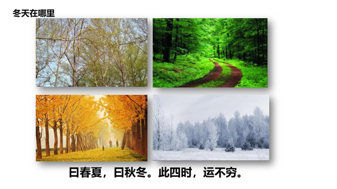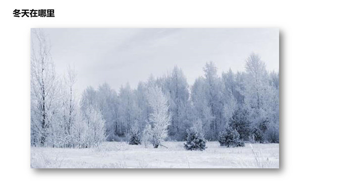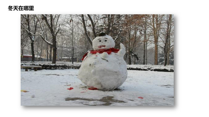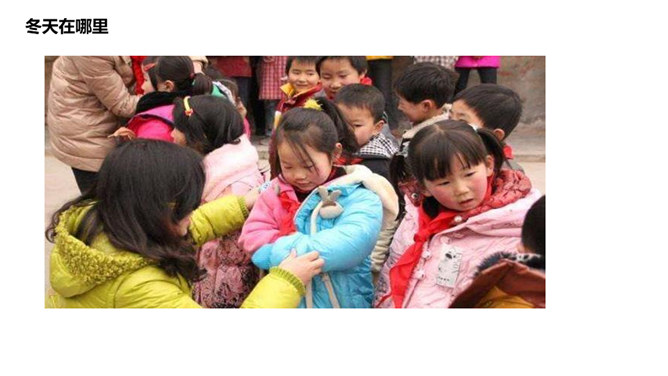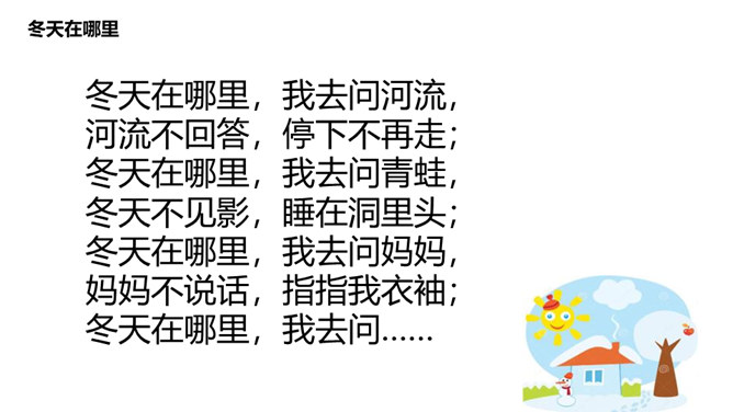 冬天在哪里,我去问河流,河流不回答,停下不再走;冬天在哪里,我去问青蛙,冬天不见影,睡在洞里头;冬天在哪里,我去问妈妈,妈妈不说话,指指我衣袖;冬天在哪里,我去问……你在冬天有什么好玩的?玩时要注意什么?你想对冬爷爷说什么?所属专题:美丽的冬天ppt。