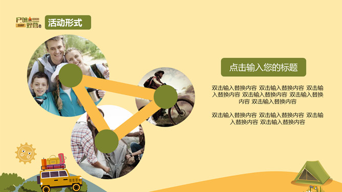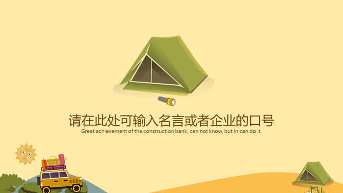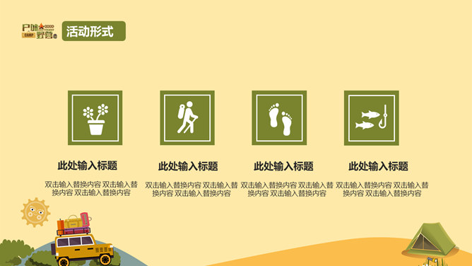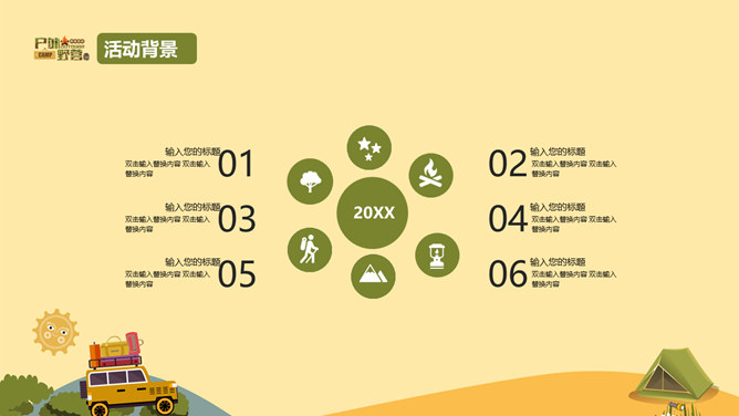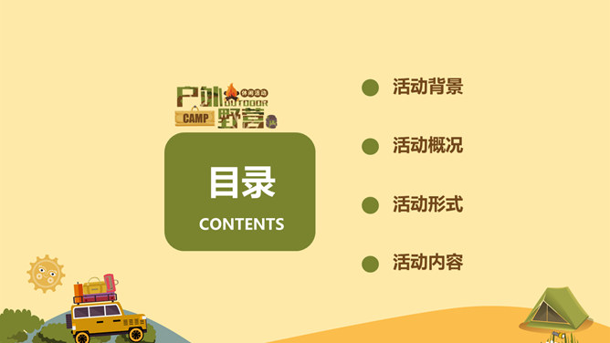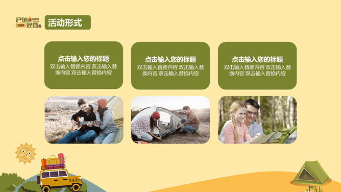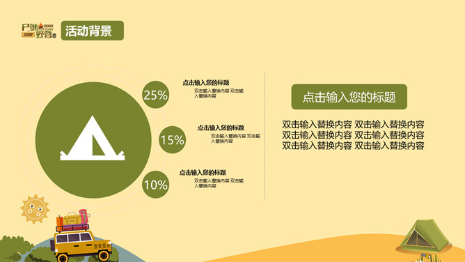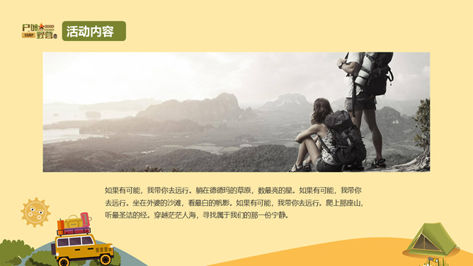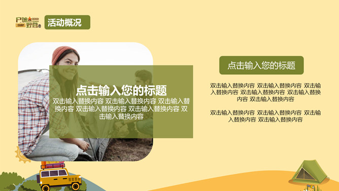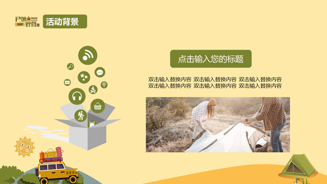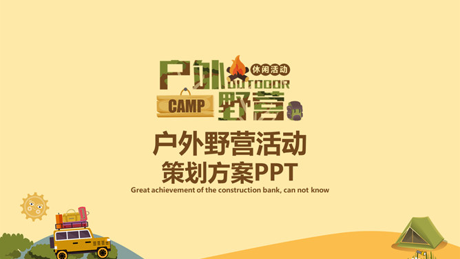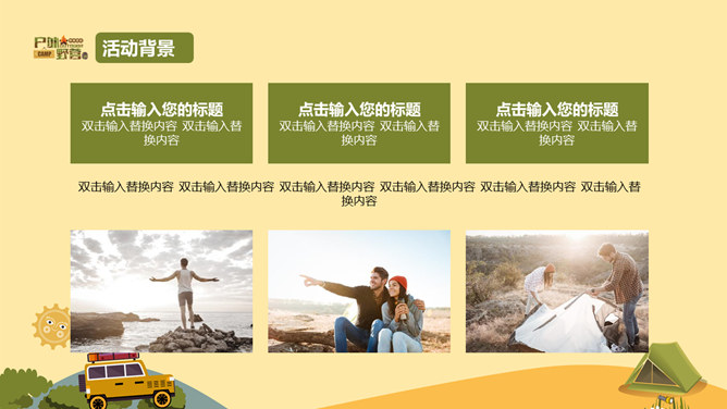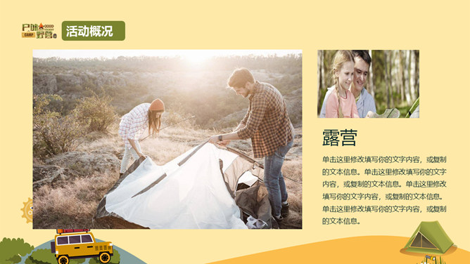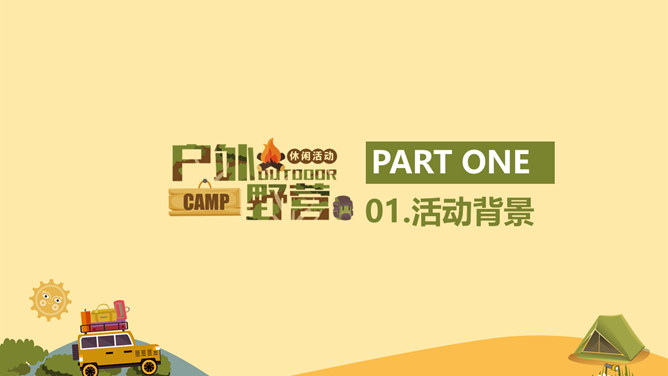 户外野营露营活动策划PPT模板。一套户外相关幻灯片模板,越野车、帐篷等露营相关元素设计。
