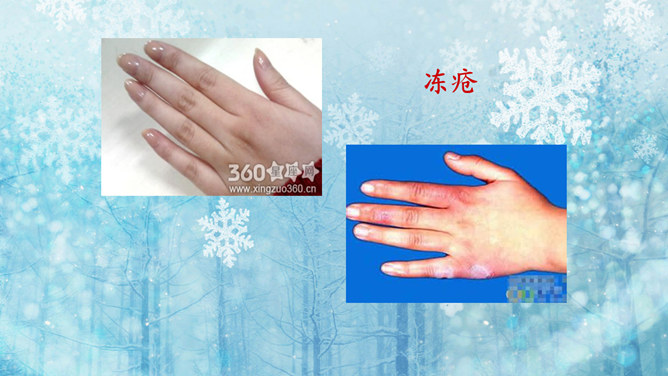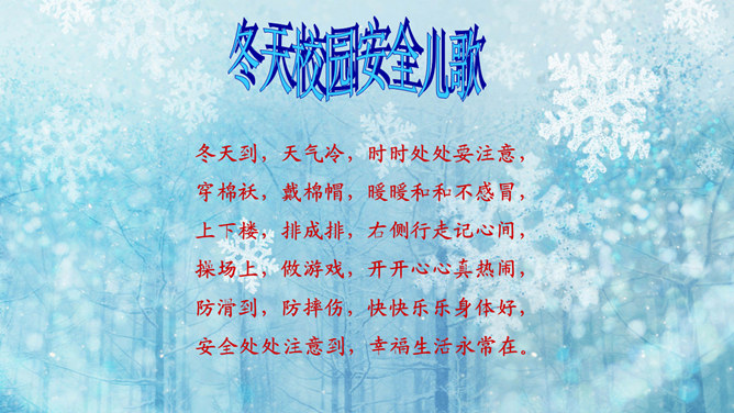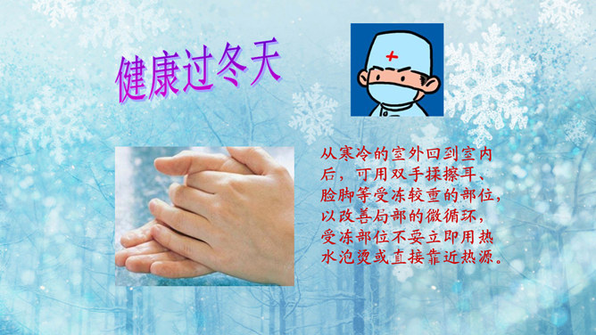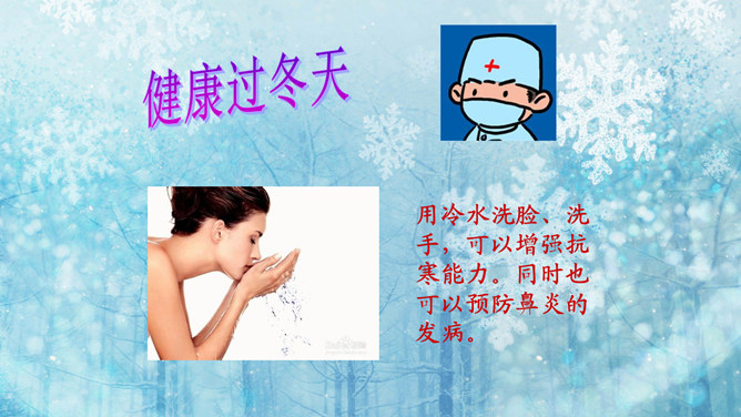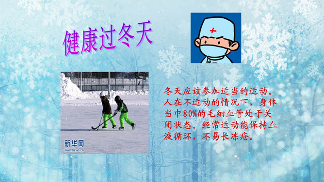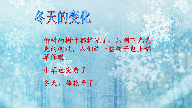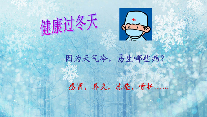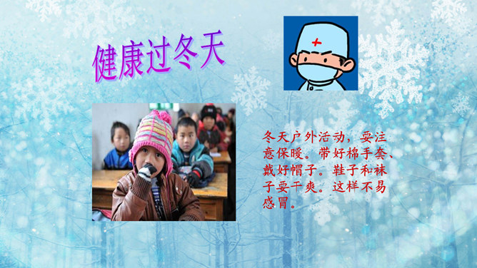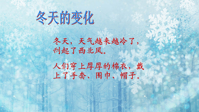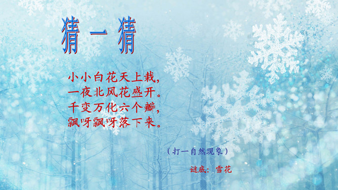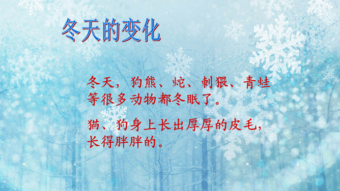 猜一猜:小小白花天上栽,一夜北风花盛开。千变万化六个瓣,飘呀飘呀落下来。(打一自然现象)谜底:雪花。冬天的变化:冬天,天气越来越冷了,刮起了西北风。人们穿上厚厚的棉衣,戴上了手套、围巾、帽子。柳树的树叶都掉光了,只剩下光秃秃的树枝,人们给一些树干包上稻草保暖。小草也变黄了。冬天,梅花开了。冬天,狗熊、蛇、刺猥、青蛙等很多动物都冬眠了。猫、狗身上长出厚厚的皮毛,长得胖胖的。因为天气冷,易生哪些病?感冒,鼻炎,冻疮,骨折…… 冬天应该参加适当的运动。所属专题:健康过冬天ppt。