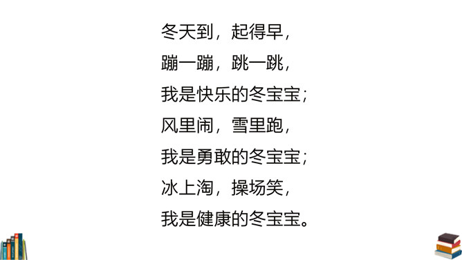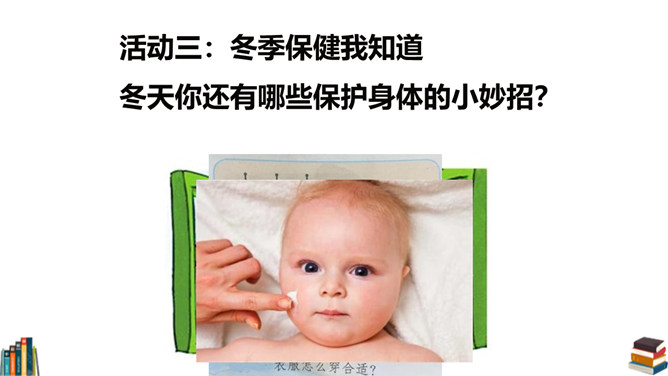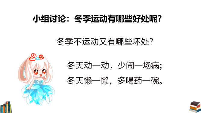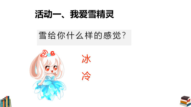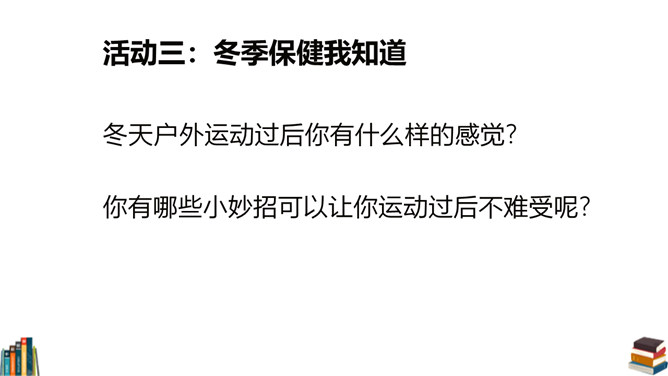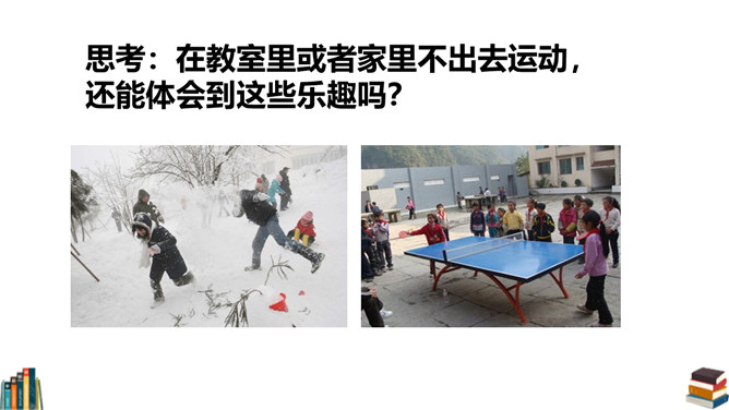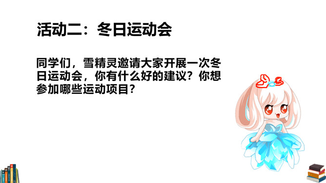 活动一、我爱雪精灵。雪给你什么样的感觉?冰冷。今天下了一场大雪,看到这样的雪你想做什么呢?活动二:冬日运动会。同学们,雪精灵邀请大家开展一次冬日运动会,你有什么好的建议?你想参加哪些运动项目?思考:在教室里或者家里不出去运动,还能体会到这些乐趣吗?所属专题:健康过冬天ppt。