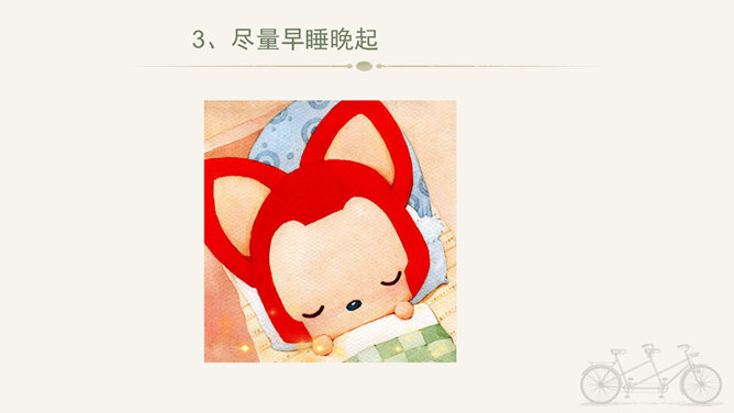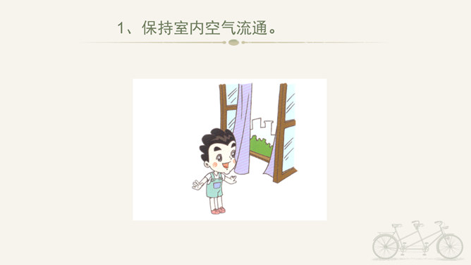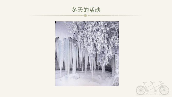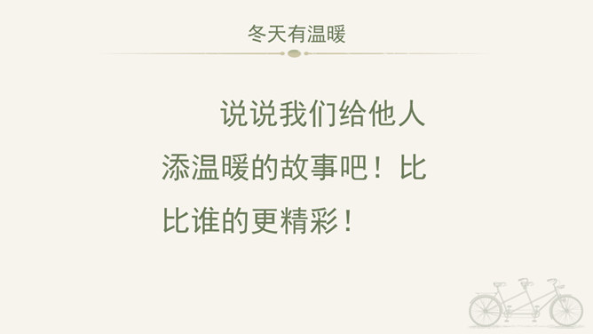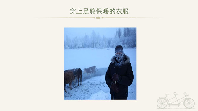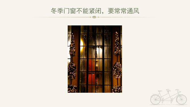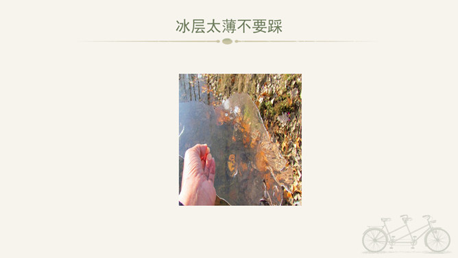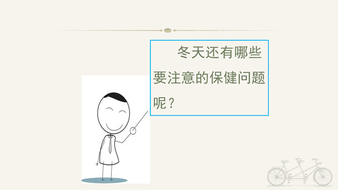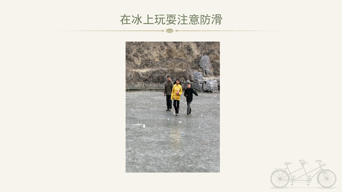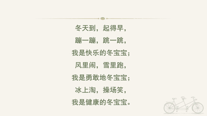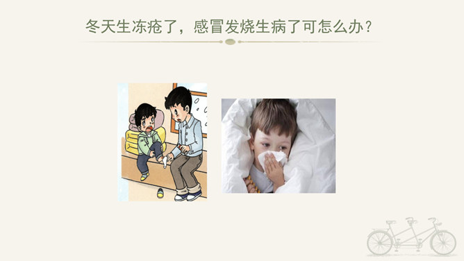 冬天到,起得早,蹦一蹦,跳一跳,我是快乐的冬宝宝;风里闹,雪里跑,我是勇敢地冬宝宝;冰上淘,操场笑,我是健康的冬宝宝。冰层太薄不要踩。在冰上玩耍注意防滑。冬季门窗不能紧闭,要常常通风。穿上足够保暖的衣服。冬天还有哪些要注意的保健问题呢?冬天生冻疮了,感冒发烧生病了可怎么办?1、保持室内空气流通。2、调节饮食。3、尽量早睡晚起。说说我们给他人添温暖的故事吧!比比谁的更精彩!所属专题:健康过冬天ppt。