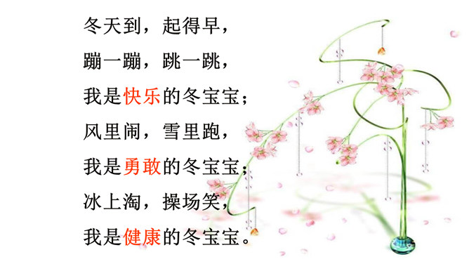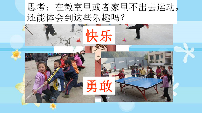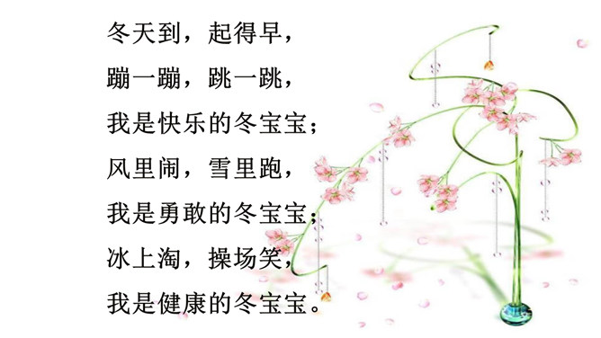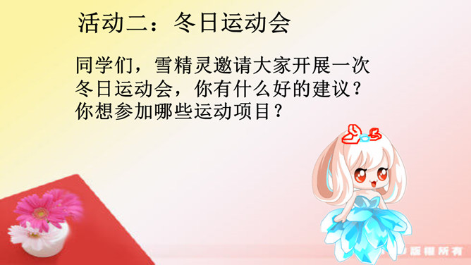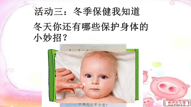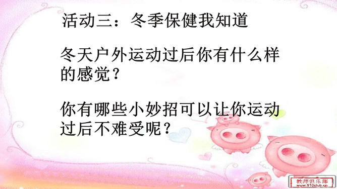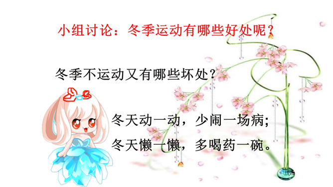小组讨论:冬季运动有哪些好处呢?冬季不运动又有哪些坏处?冬天动一动,少闹一场病;冬天懒一懒,多喝药一碗。活动三:冬季保健我知道。冬天户外运动过后你有什么样的感觉?你有哪些小妙招可以让你运动过后不难受呢?所属专题:健康过冬天ppt。