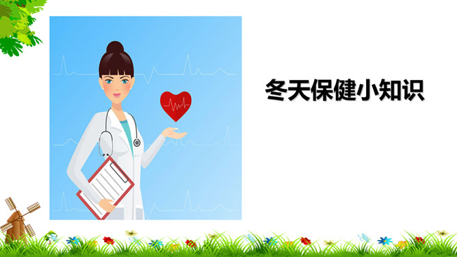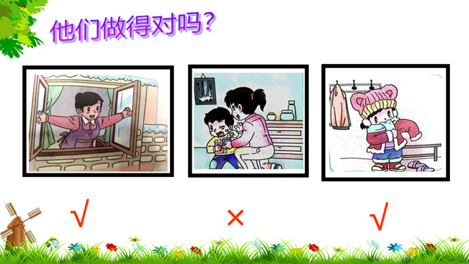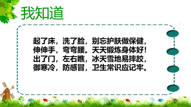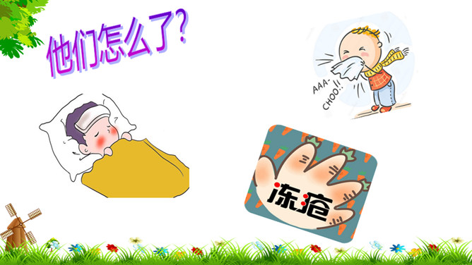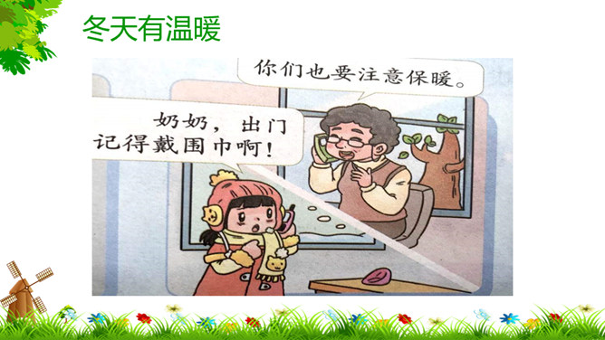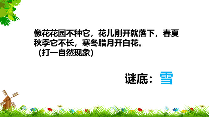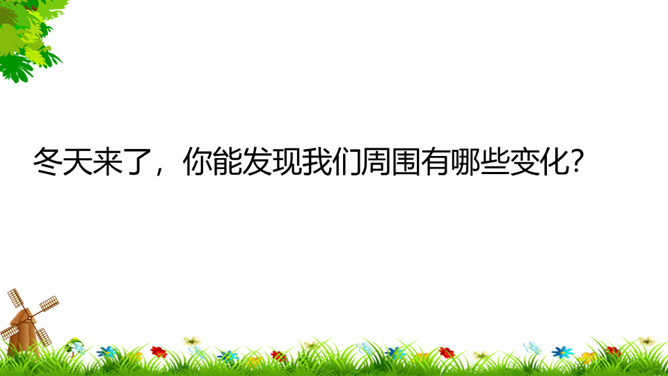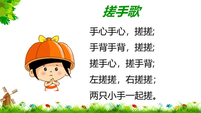 像花花园不种它,花儿刚开就落下,春夏秋季它不长,寒冬腊月开白花。(打一自然现象)谜底:雪。冬天来了,你能发现我们周围有哪些变化?这些都是战胜寒冷的好办法。冬天,我们的小手常常被冻得红彤彤的,如果不注意,手会冻着,有时还会生冻疮呢!那该怎样保护我们的小手呢?老师教你们一个最简单的“搓手”活动。来!伸出我们的手。搓手歌:手心手心,搓搓;手背手背,搓搓;搓手心,搓手背;左搓搓,右搓搓;两只小手一起搓。所属专题:健康过冬天ppt。