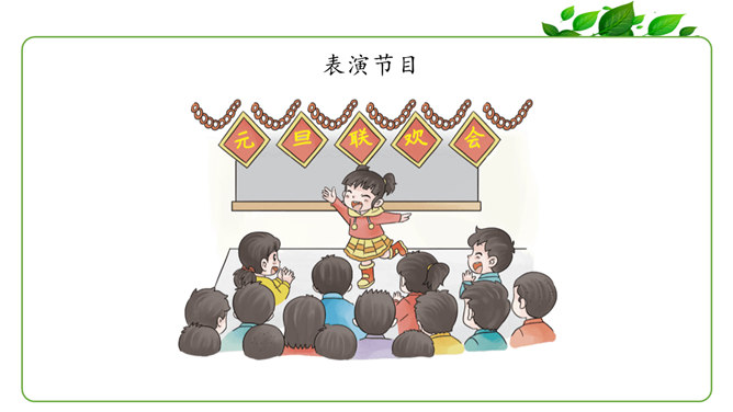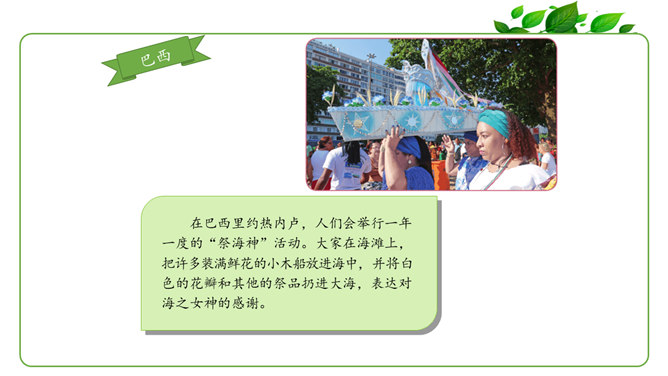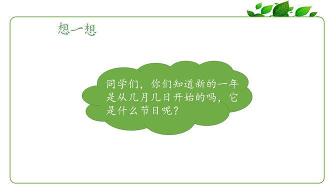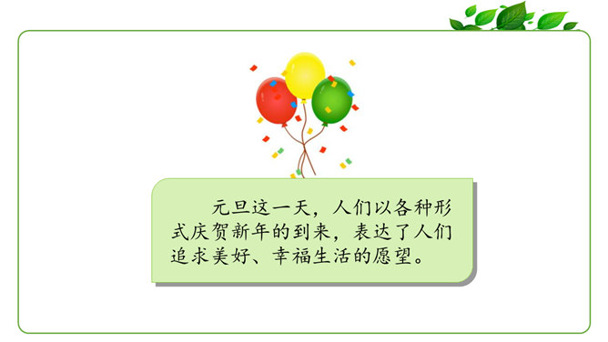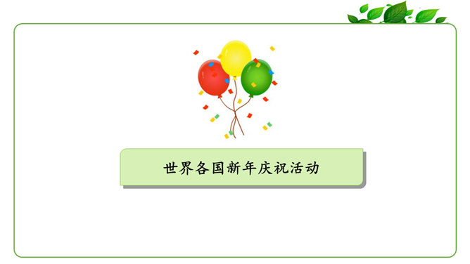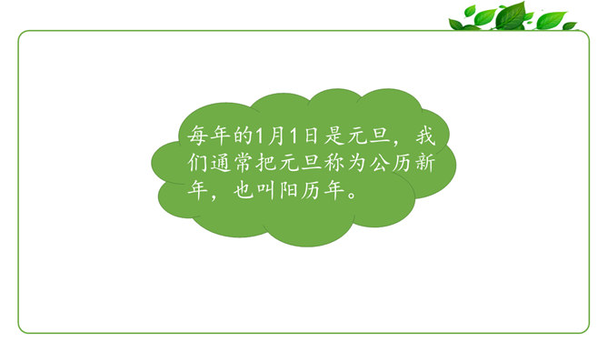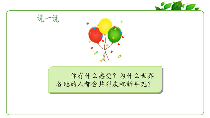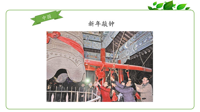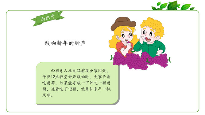 同学们,你们知道新的一年是从几月几日开始的吗,它是什么节日呢?每年的1月1日是元旦,我们通常把元旦称为公历新年,也叫阳历年。在巴西里约热内卢,人们会举行一年一度的“祭海神”活动。大家在海滩上,把许多装满鲜花的小木船放进海中,并将白色的花瓣和其他的祭品扔进大海,表达对海之女神的感谢。西班牙人在元旦前夜全家团聚,午夜12点教堂钟声敲响时,大家争着吃葡萄,如果能每敲一下钟吃一颗葡萄,连着吃下12颗,便象征来年一帆风顺。你有什么感受?为什么世界各地的人都会热烈庆祝新年呢?所属专题:快乐过新年ppt。