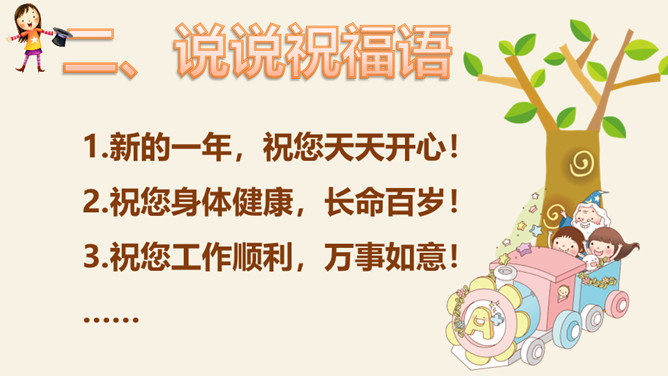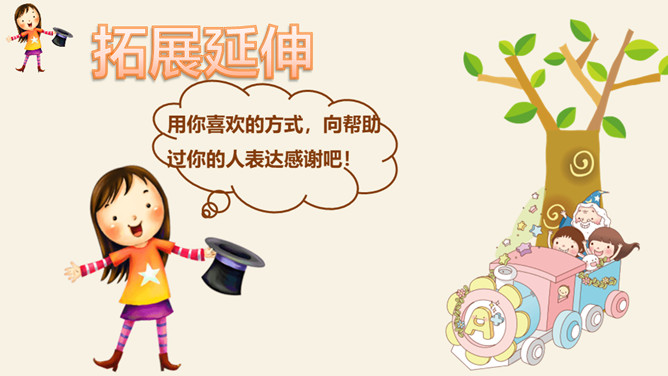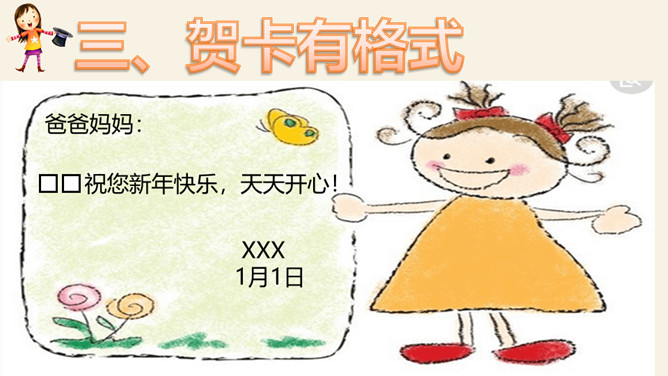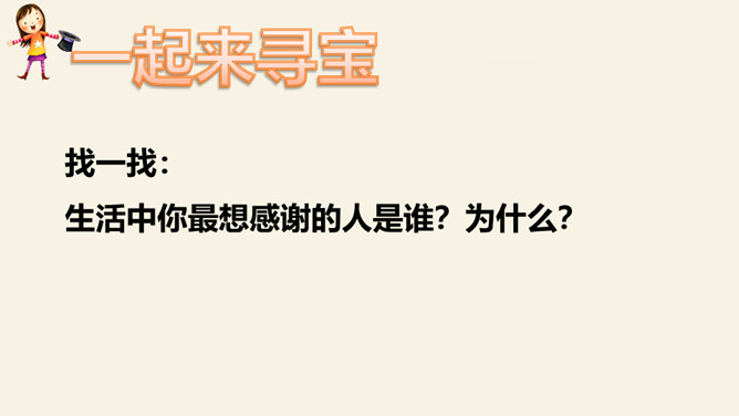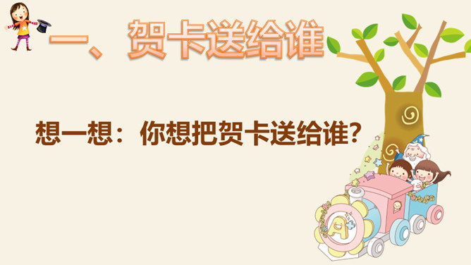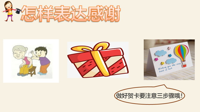 找一找:生活中你最想感谢的人是谁?为什么?爸爸妈妈、爷爷奶奶、老师、同学、警察。怎样表达感谢?做好贺卡要注意三步骤哦!想一想:你想把贺卡送给谁?说说祝福语。用你喜欢的方式,向帮助过你的人表达感谢吧!所属专题:新年的礼物ppt。
