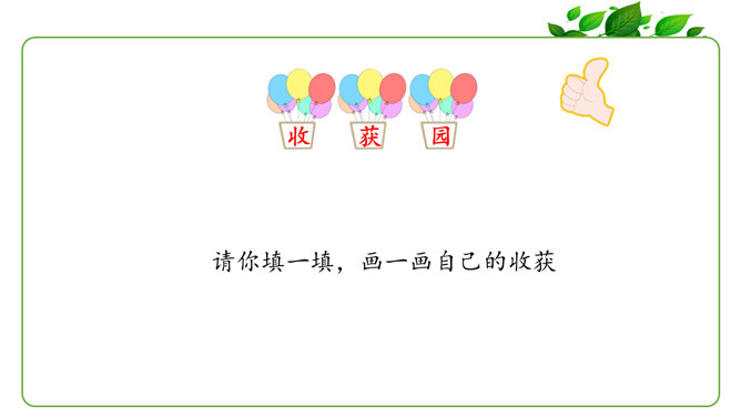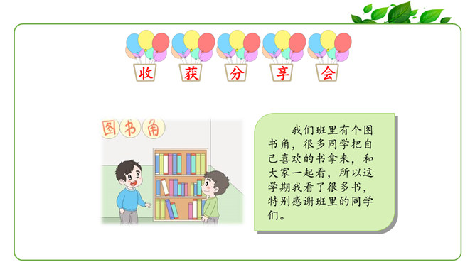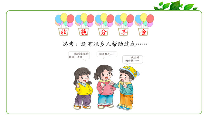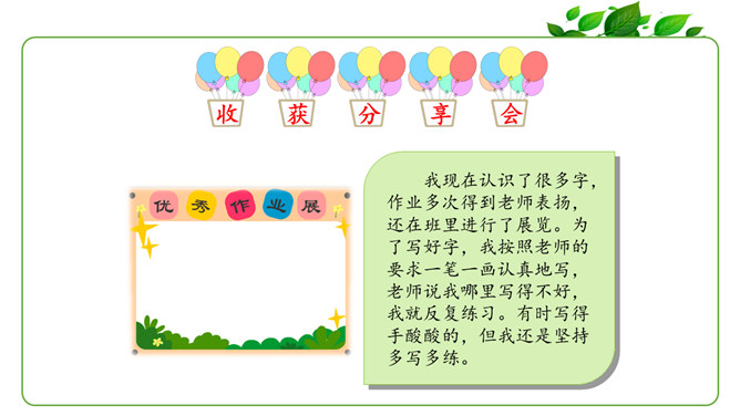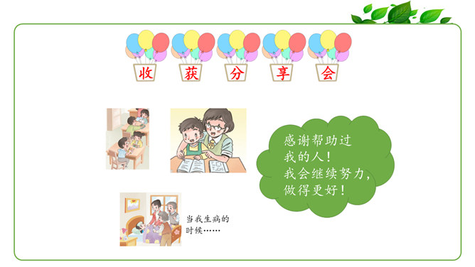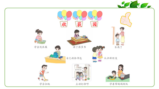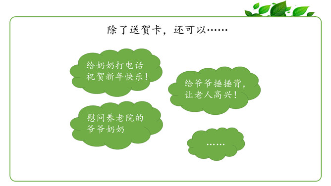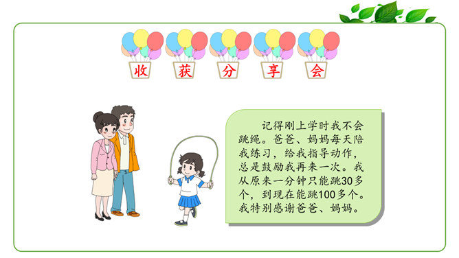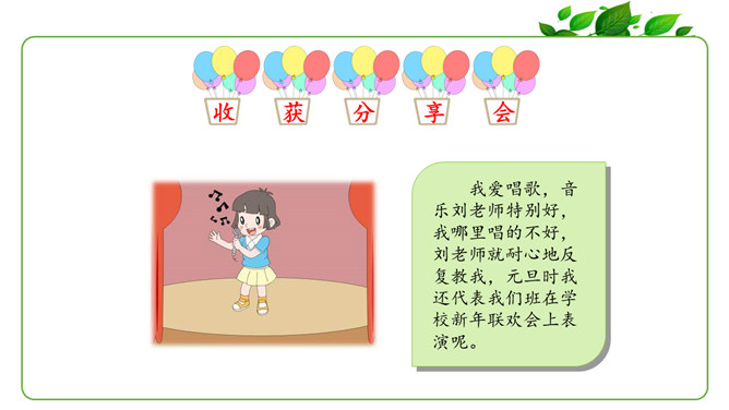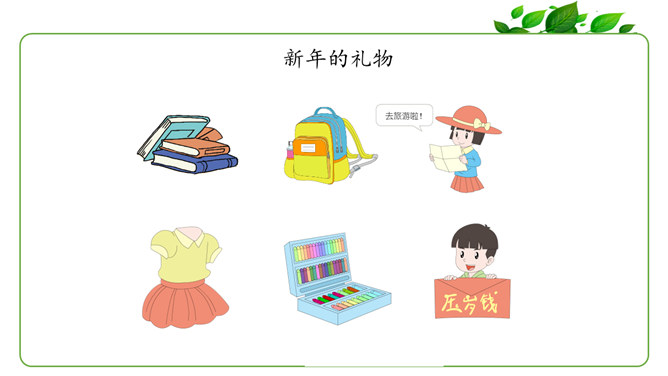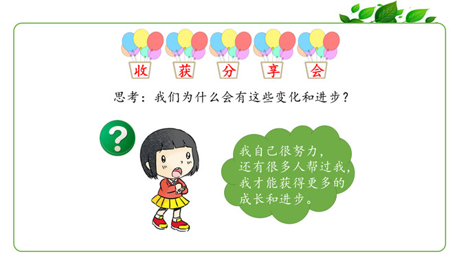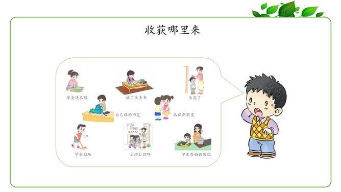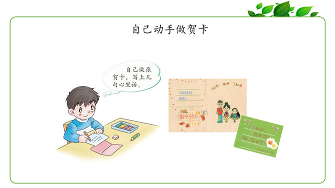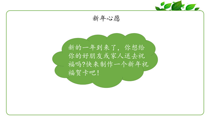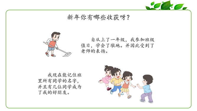 新年你有哪些收获呀?自从上了一年级,我参加班级值日,学会了墩地。并因此受到了老师的表扬。我现在能记住班里所有同学的名字,并且有几位同学成为了我的好朋友。请你填一填,画一画自己的收获。思考:我们为什么会有这些变化和进步?我自己很努力,还有很多人帮过我,我才能获得更多的成长和进步。感谢帮助过我的人!我会继续努力,做得更好!新的一年到来了,你想给你的好朋友或家人送去祝福吗?快来制作一个新年祝福贺卡吧!让我们动手折一颗心,送给曾经帮助过自己的老师、同学等,表达自己的祝愿和感谢之情。所属专题:新年的礼物ppt。