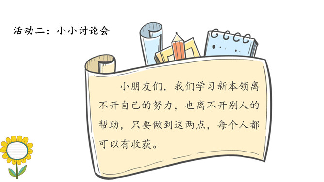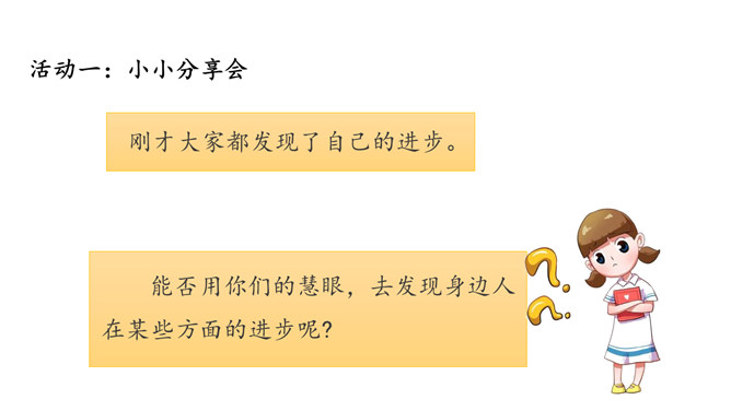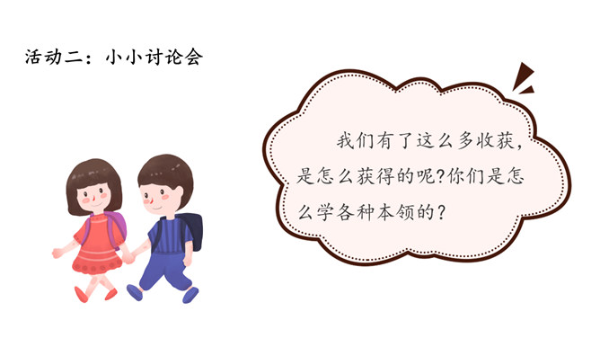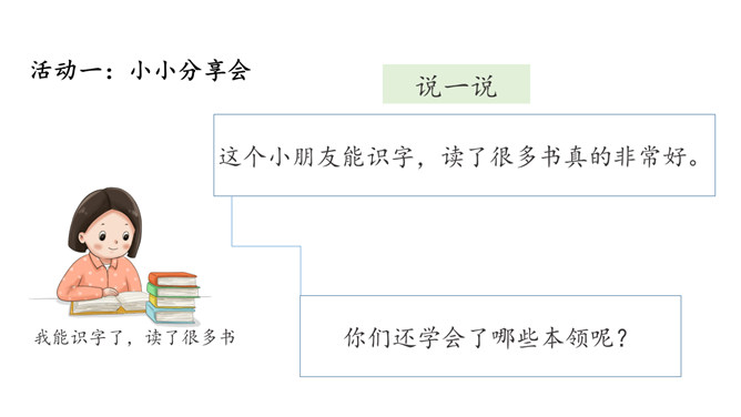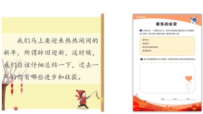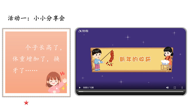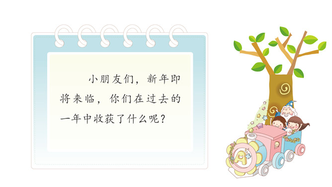 小朋友们,新年即将来临,你们在过去的一年中收获了什么呢?我们马上要迎来热热闹闹的新年,所谓辞旧迎新,这时候,我们应该仔细总结一下,过去一年的你有哪些进步和收获。个子长高了,体重增加了,换牙了……这一年真是特殊的一年,你们从幼儿园来到了小学,身体也随着时间在发生着变化,你们长大了。这一年我们小朋友不仅在身体上发生了变化,在学习的路上也是越走越顺,知识积累越来越多,是这样吗?我们来看看书本上这个小朋友,他是怎么说的?这个小朋友能识字,读了很多书真的非常好。所属专题:新年的礼物ppt。